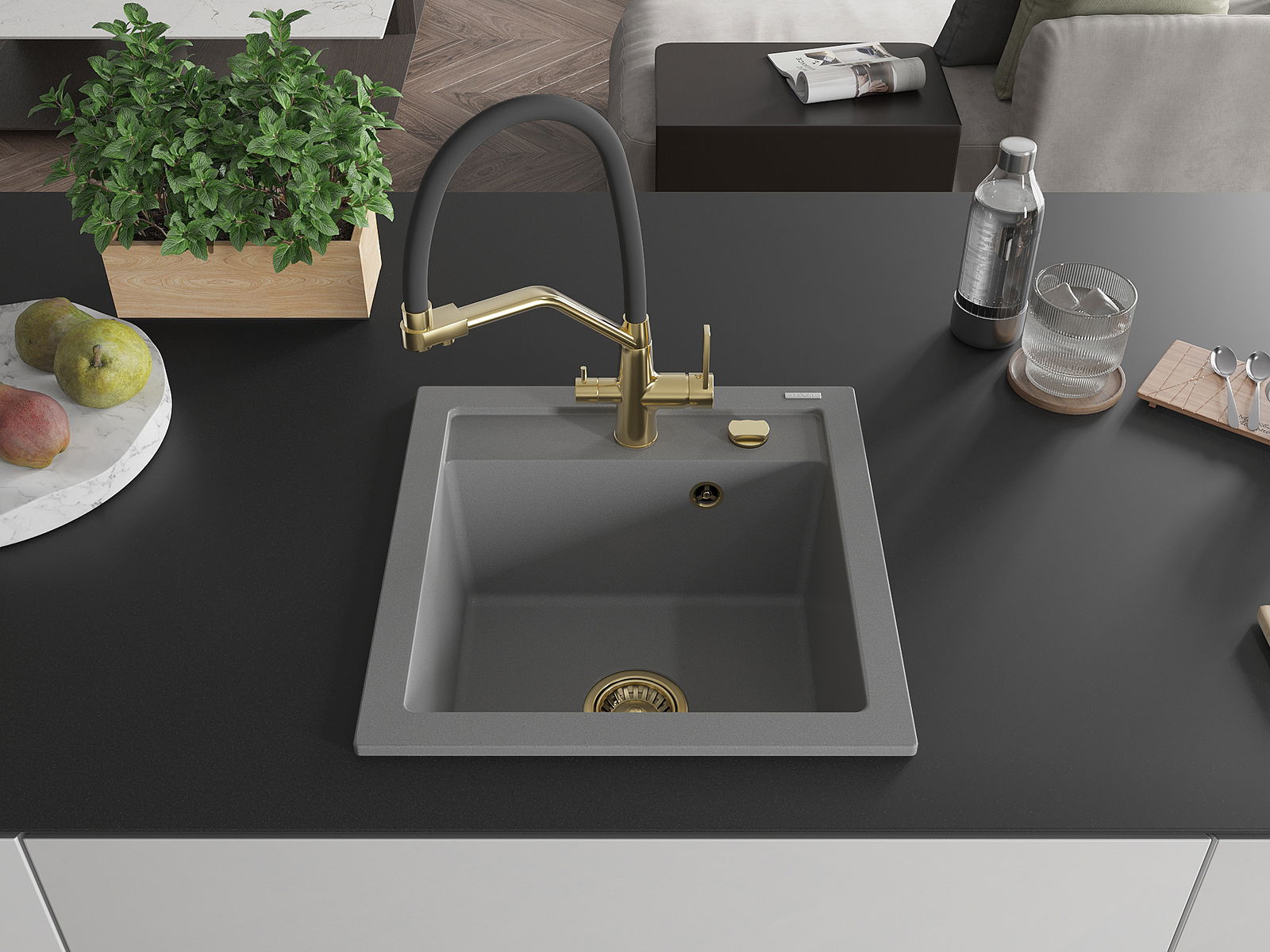 De Spullsteen huet e virgefraist Lach mat engem Duerchmiesser vu 35 mm fir selwer auszeschloen. Et kann ënner anerem genotzt ginn fir e Spender fir Flëssegkeet z'installéieren, deen d'Präsenz vu Plastikfläschen an der Kichen eliminéiert an hir en elegante Finish gëtt.