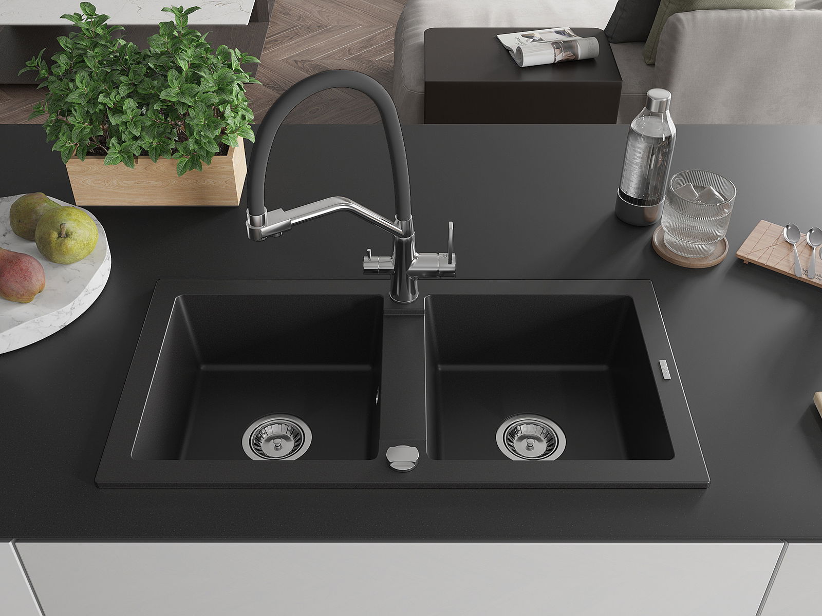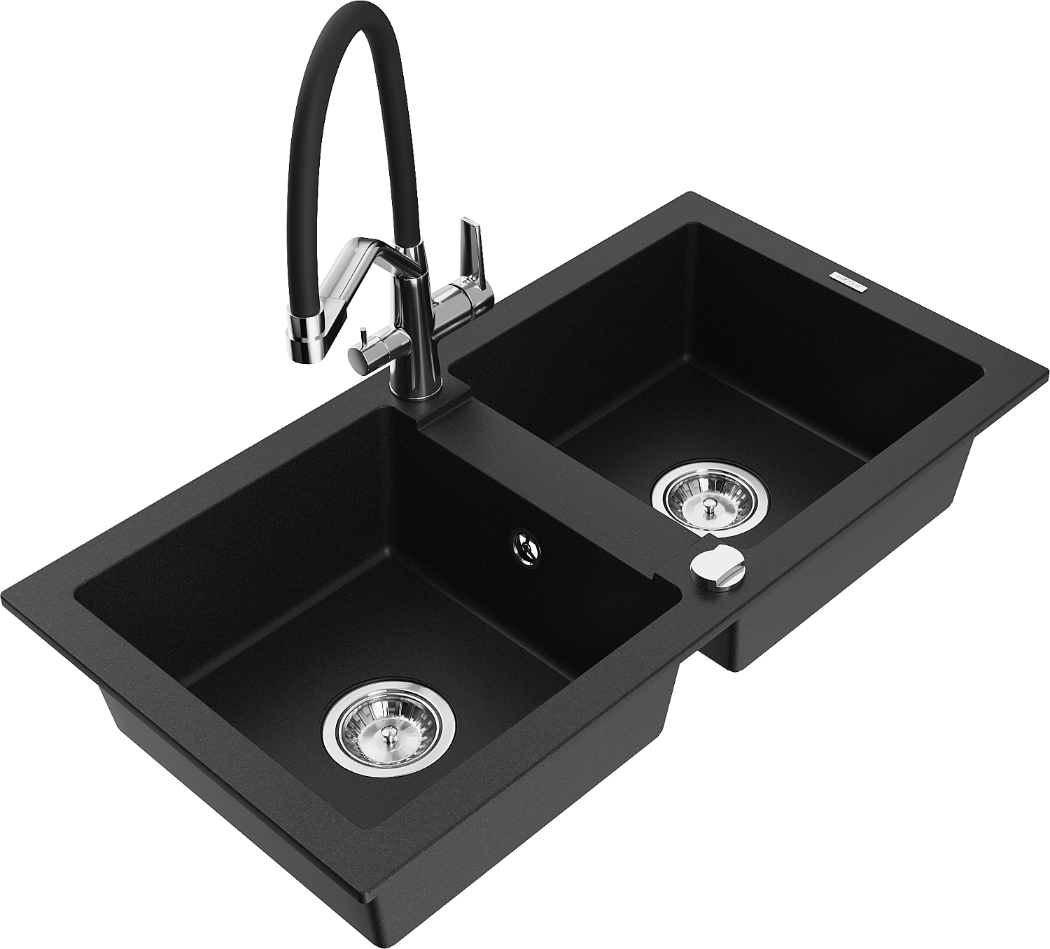 Mexen Mario granit Ëvier mat an 2 Deeler mat kichenwasserhahn Duo, schwaarz - 6504-77-671701-07