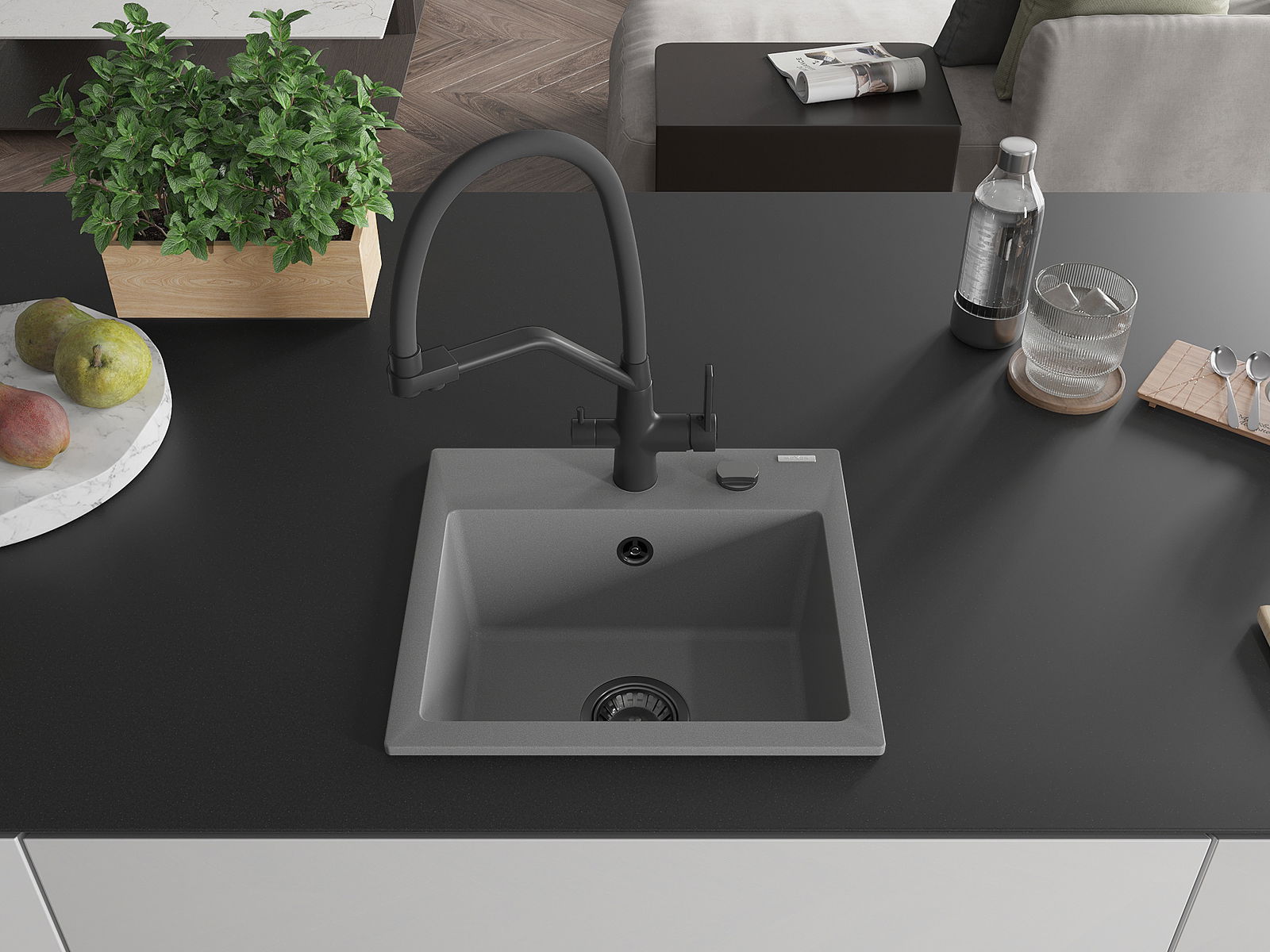 Den Ëmwäschbecken ass aus héichwäertege Granit gemaach. Et stellt eng elegant awer virun allem praktesch Ergänzung fir all Kichen duer, onofhängeg vun hirem Stil. Déi héich Qualitéit an Haltbarkeet vum Granit suergen fir méi järelaang Benotzung.