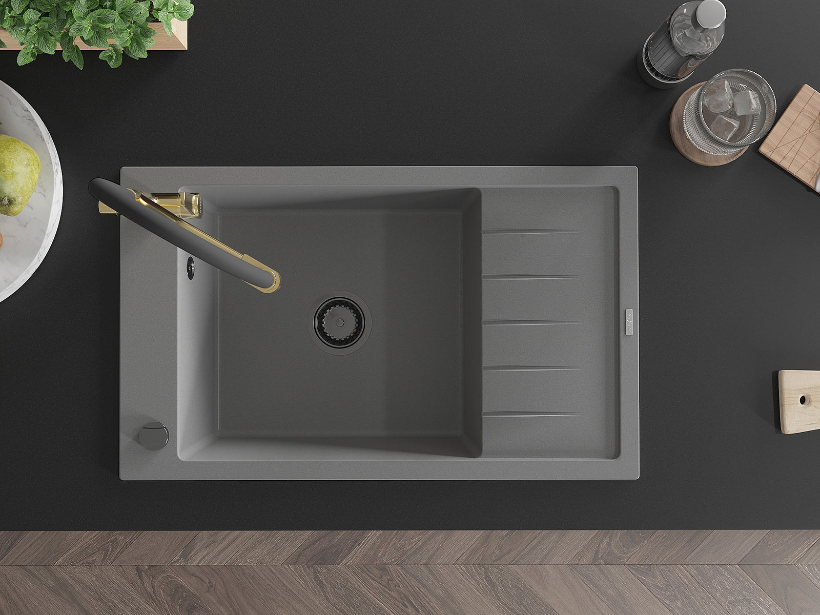 Mexen Elias Granit-Spullsteen mat 1 Haaptkummer mat Ofschaecker an Duokichenkraan, gro - 6511-71-671701-57-B