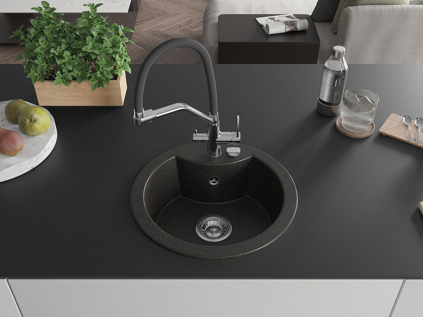 Den Ëmwäschbecken ass aus héichwäertege Granit gemaach. Et stellt eng elegant awer virun allem praktesch Ergänzung fir all Kichen duer, onofhängeg vun hirem Stil. Déi héich Qualitéit an Haltbarkeet vum Granit suergen fir méi järelaang Benotzung.