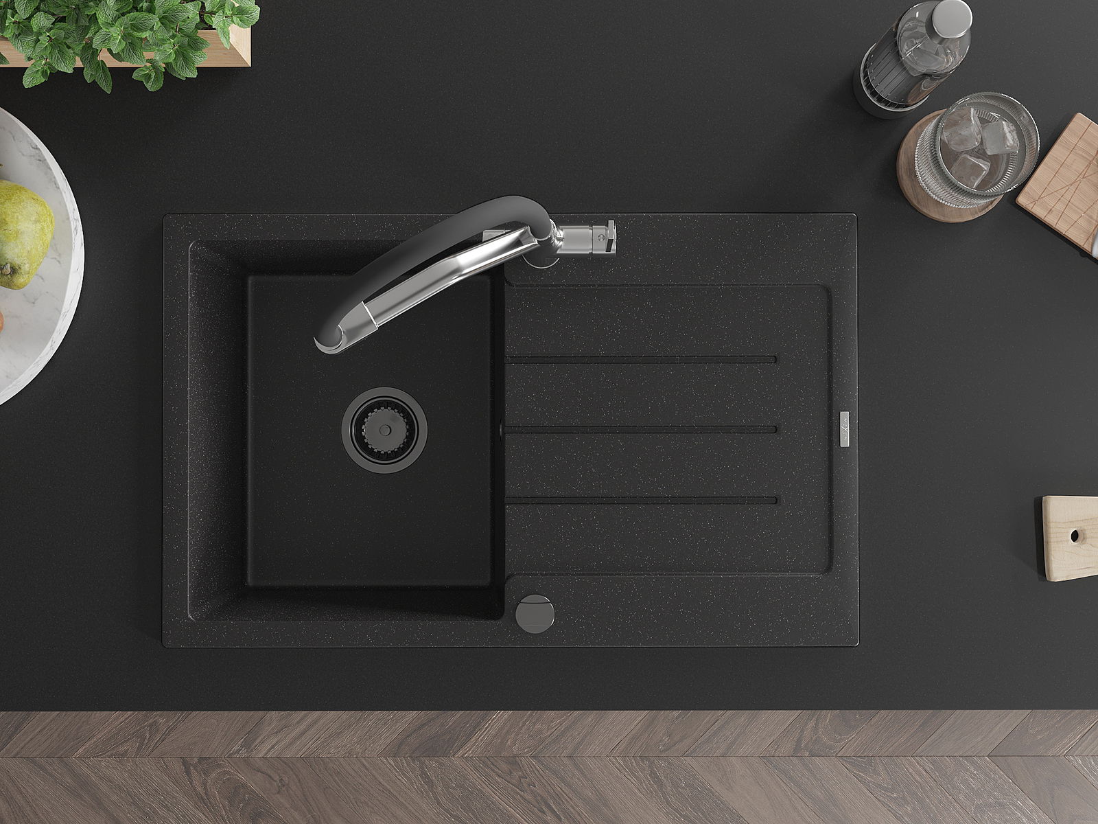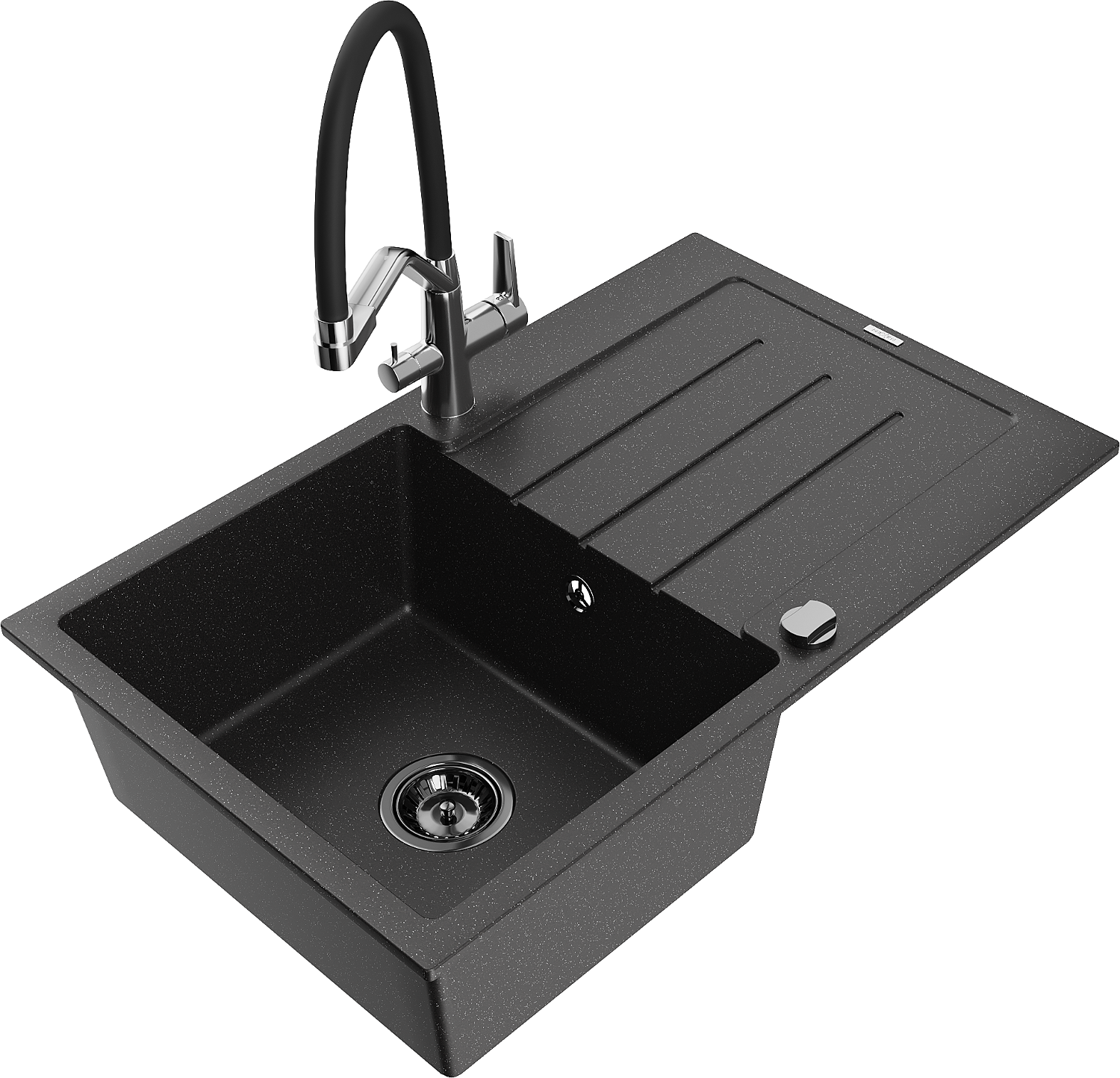 Mexen Bruno 1-Sektioun Granitspull mat Oflaufschoss an Kichekraan Duo, schwaarz/sëlwer Metalik - 6513-73-671701-07-B