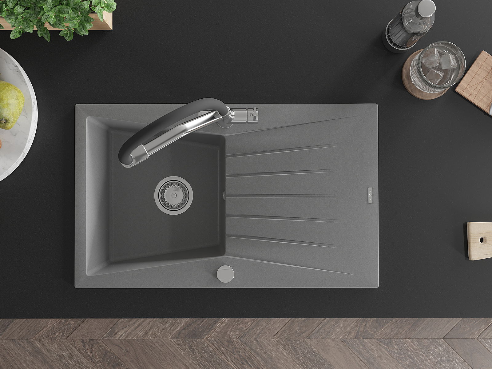 Mexen Cesar Granit-Spullstein mat 1-kompag mat Drëppelberäich an Kichenbatterie Duo, gro - 6514-71-671701-07