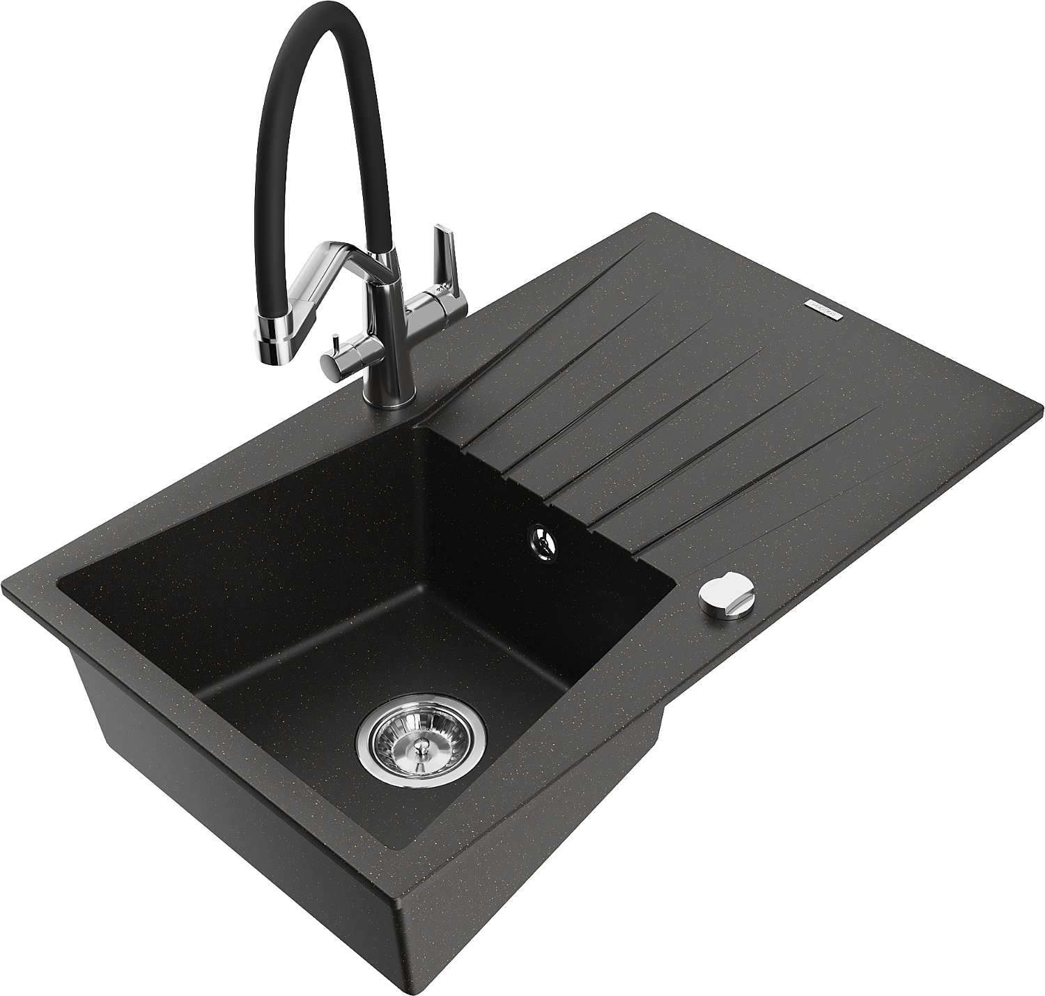 Mexen Cesar Granitspullang mat enger Schoss an eng Duo-Kichenbatterie, schwaarz/gëllene Metalik - 6514-75-671701-07