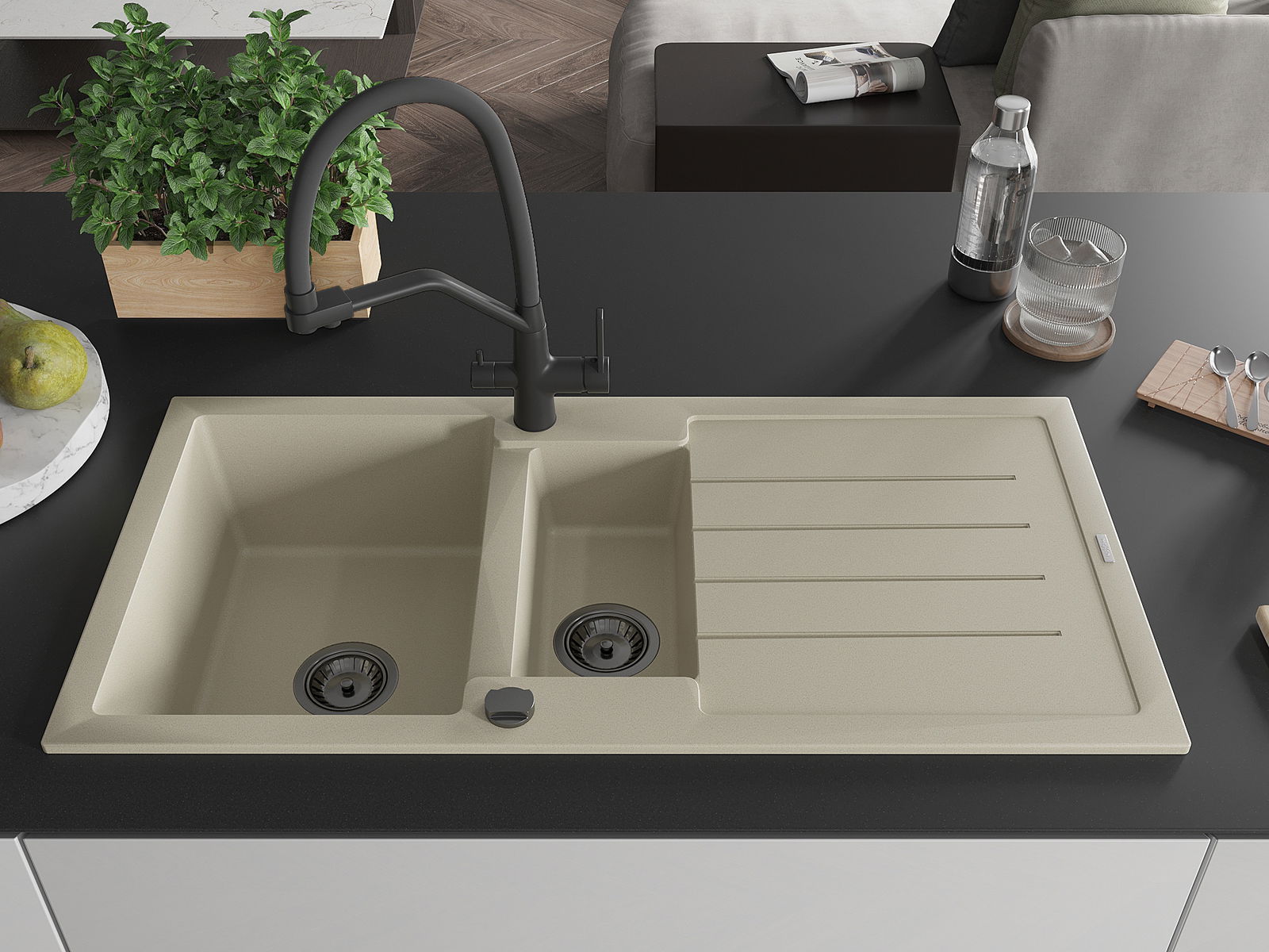D'Uewerfläch vum Spullstee ass fleck- a verfärbungsresistent, wat se einfach ze botzen mécht an hir Faarf iwwer eng laang Zäit vum Gebrauch behalen léisst. Esthetesch an praktesch Ergänzung fir all Kichen.