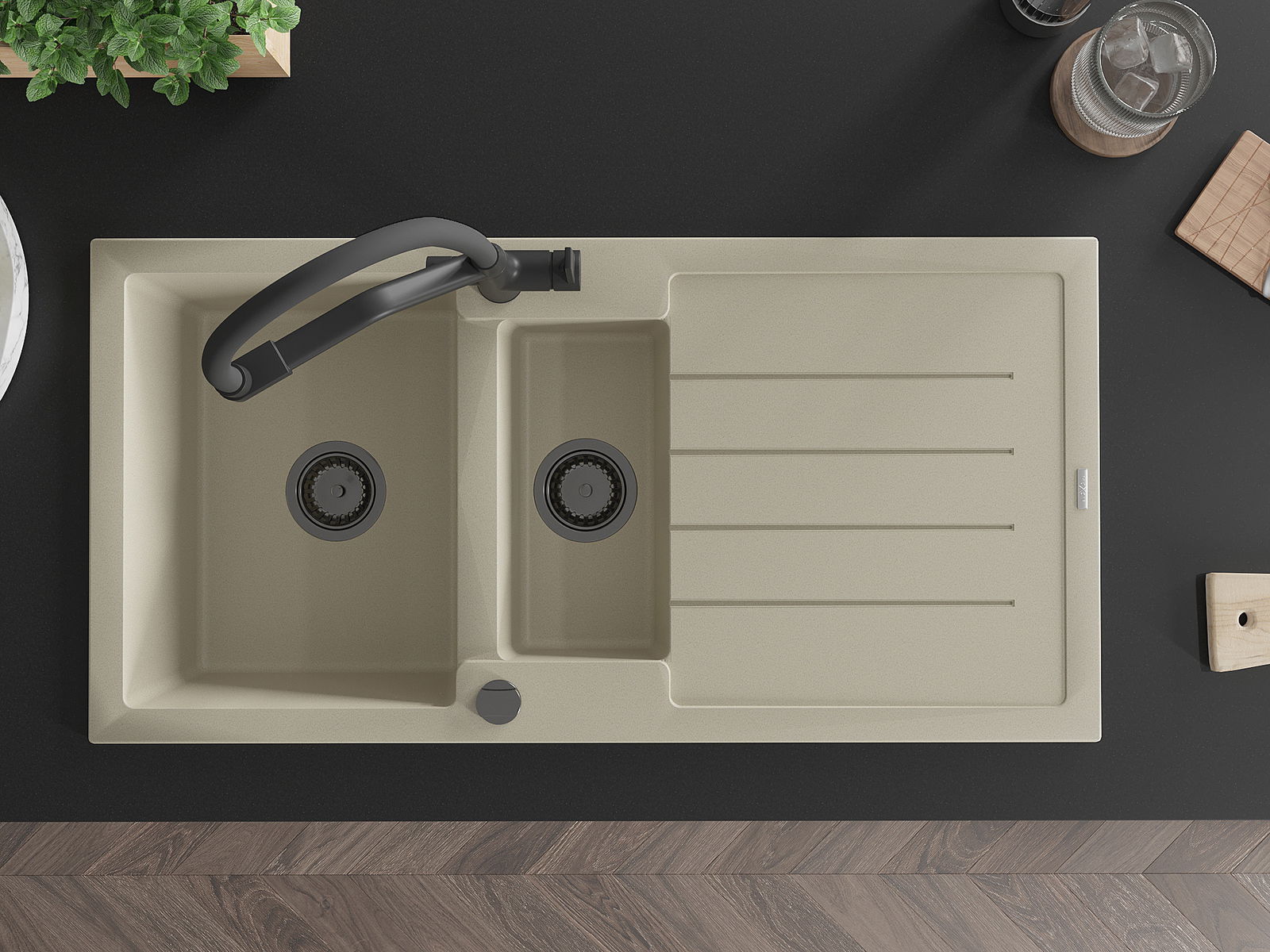 Den Ëmwäschbecken ass aus héichwäertege Granit gemaach. Et stellt eng elegant awer virun allem praktesch Ergänzung fir all Kichen duer, onofhängeg vun hirem Stil. Déi héich Qualitéit an Haltbarkeet vum Granit suergen fir méi järelaang Benotzung.