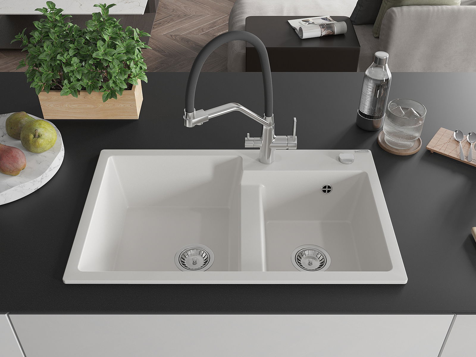 Mexen Tomas Granit-Spullsteen mat 2 Kummer mat Kichekraan Duo, wäiss - 6516-20-671701-07