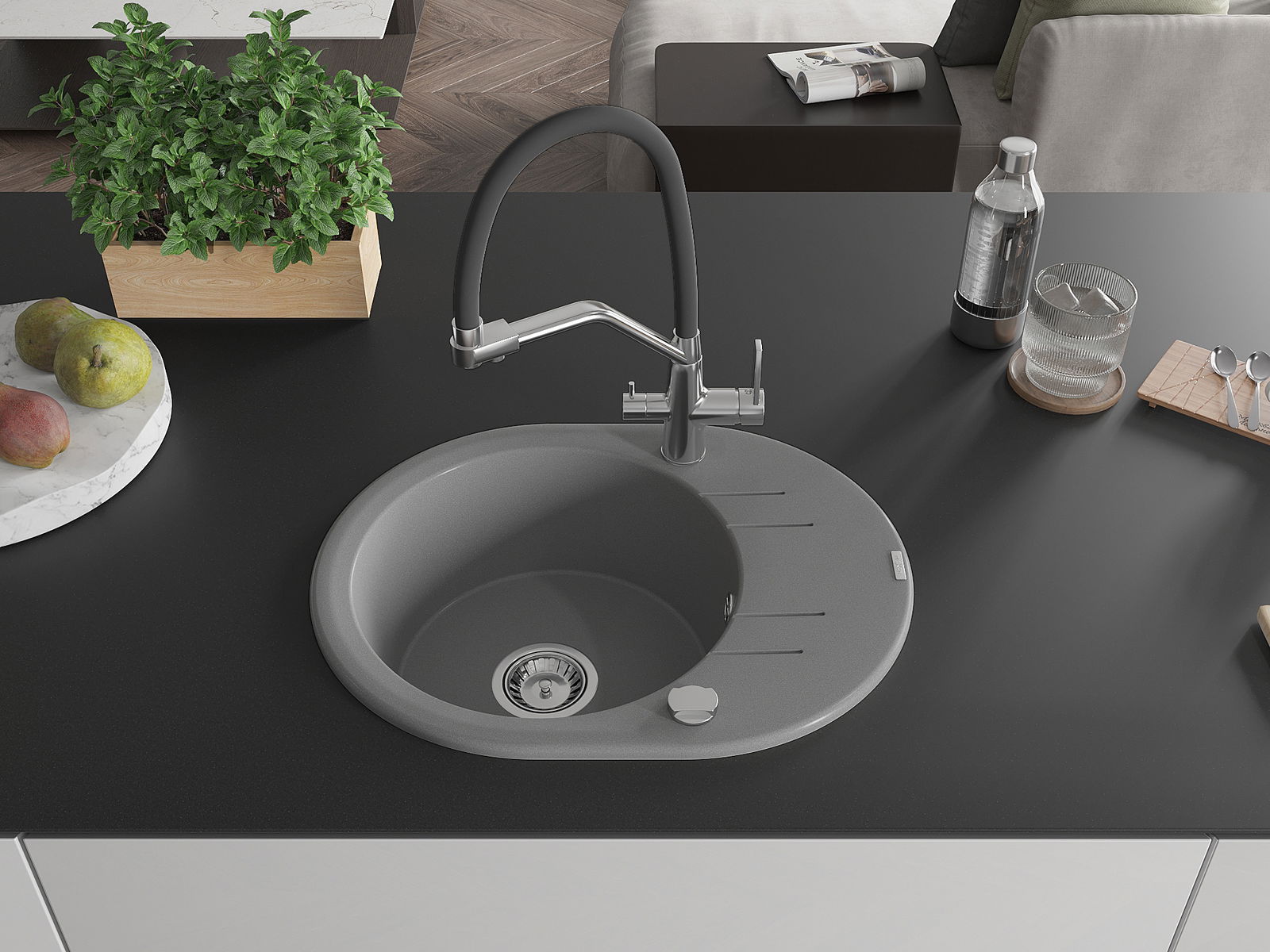 Den Ëmwäschbecken ass aus héichwäertege Granit gemaach. Et stellt eng elegant awer virun allem praktesch Ergänzung fir all Kichen duer, onofhängeg vun hirem Stil. Déi héich Qualitéit an Haltbarkeet vum Granit suergen fir méi järelaang Benotzung.