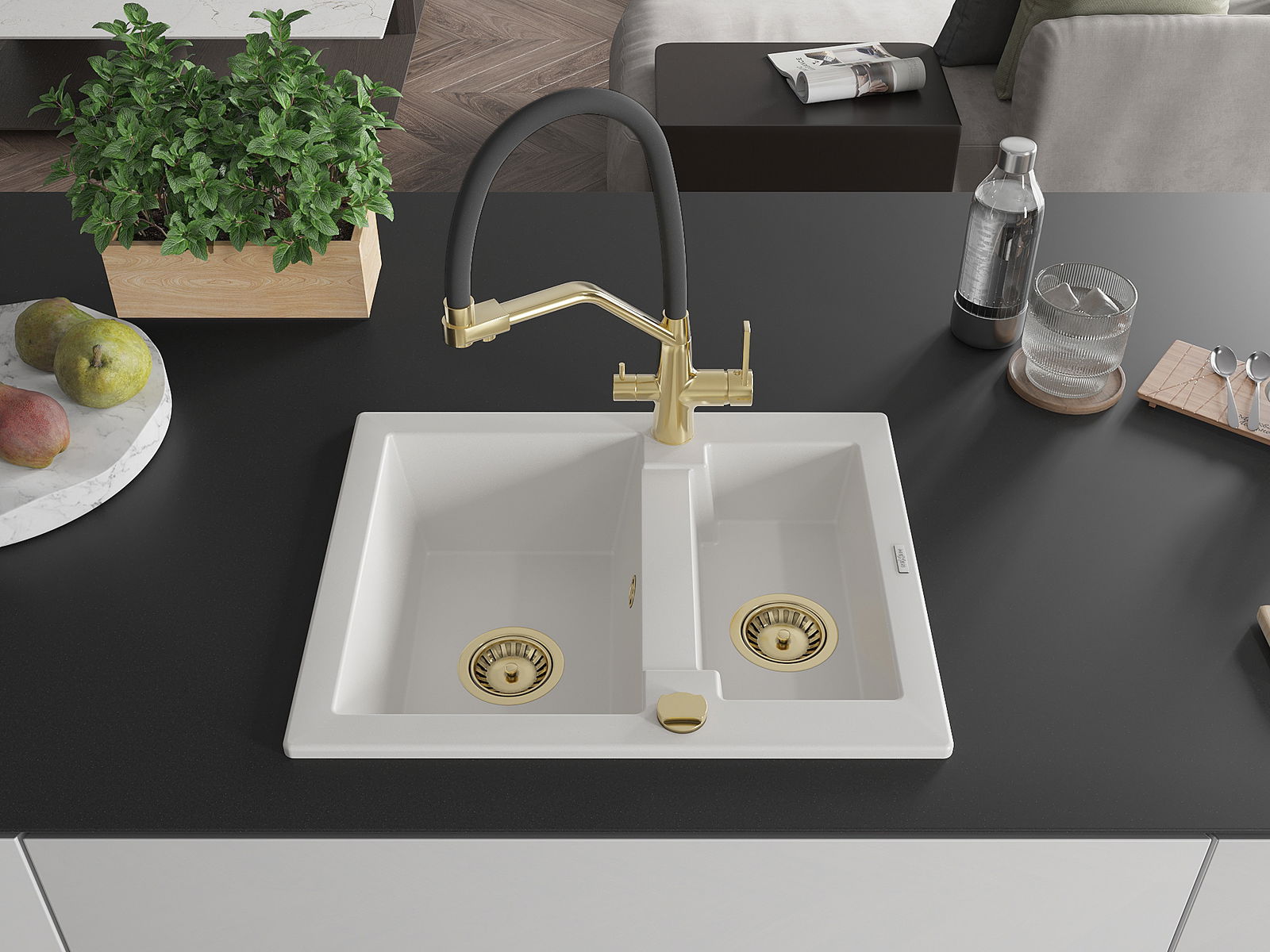 Mexen Carlos 1,5-undhalb Kammer Granitspullsteen mat Küchkran Duo, wäiss - 6518-20-671701-57-G