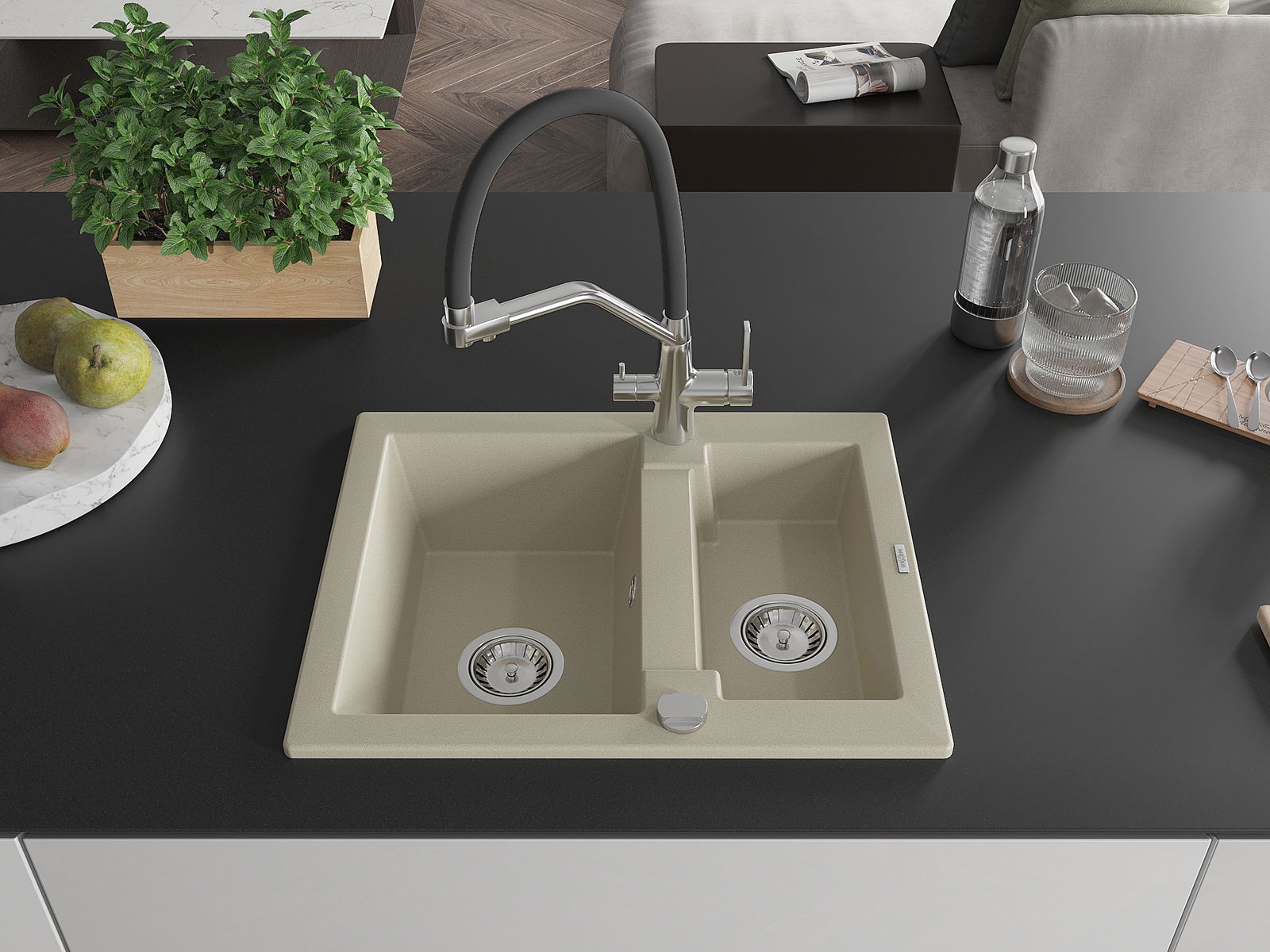 Mexen Carlos granit-Évier 1,5-an Équipe mat Buedspëtz Duo, beige - 6518-69-671701-07