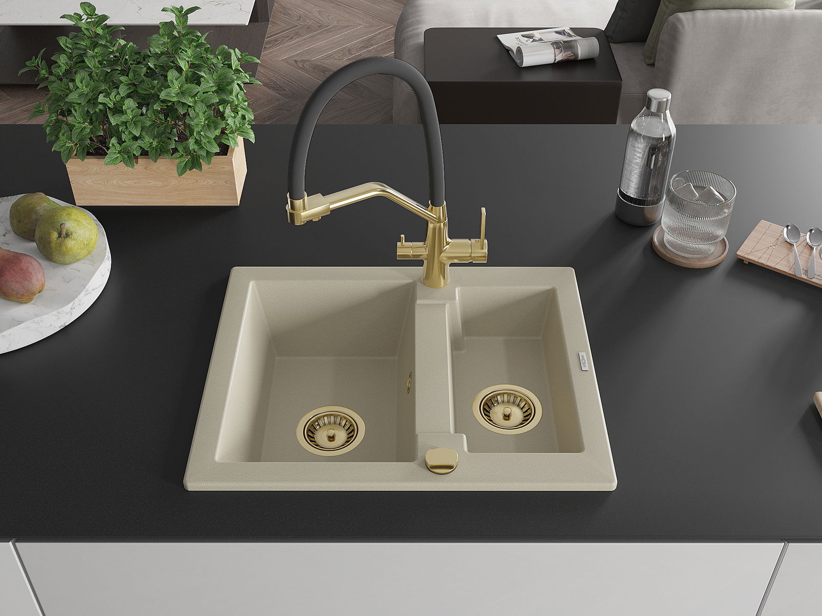 Mexen Carlos Granit-Spullsteen 1,5-Kummer mat Kichenkrunn Duo, béich - 6518-69-671701-57-G