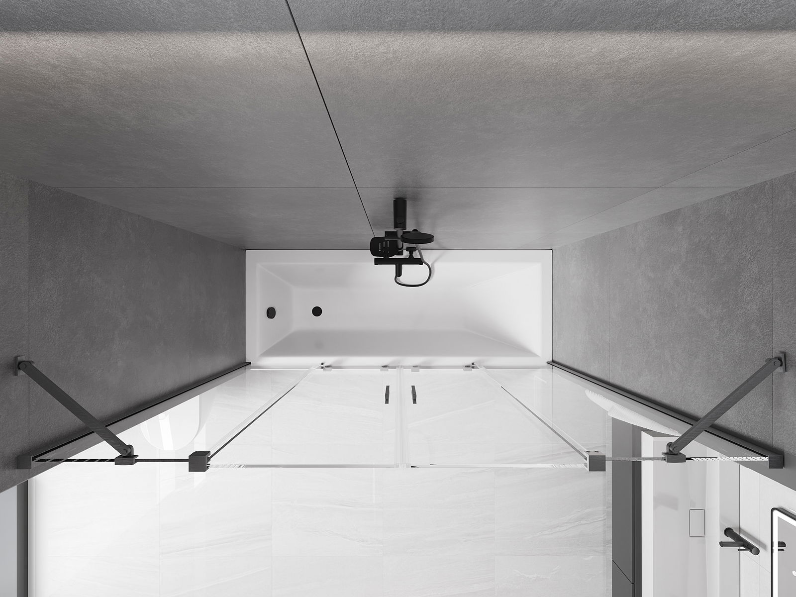 Dank dem universellen Montagesystem kann de Paravent je no Bedierfness op der rietser oder lénkser Säit montéiert ginn. Sou kanns de eng Dusch plangen, déi op de Raum vun der Buedzëmmer ugepasst ass.