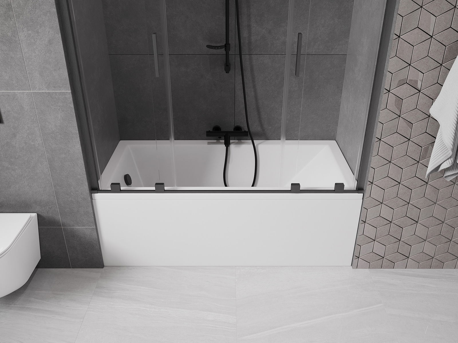 Dank dem universellen Montagesystem kann de Paravent je no Bedierfness op der rietser oder lénkser Säit montéiert ginn. Sou kanns de eng Dusch plangen, déi op de Raum vun der Buedzëmmer ugepasst ass.