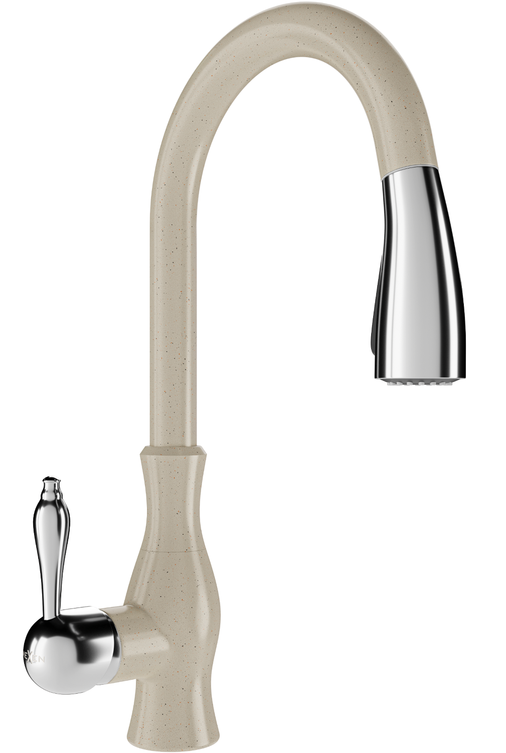 Batterien mat engem erausziehbaren Ausgus sinn eng praktesch Léisung an der Kichen. Mat der erausziehbarer Kapp kënne mir all Wénkel vum Spullsteen an vun de groussen Tëppen erreechen, Genee Geméis an Uebst ze wäschen, ouni d'Géigend ëm de Spullsteen naass ze maachen.
