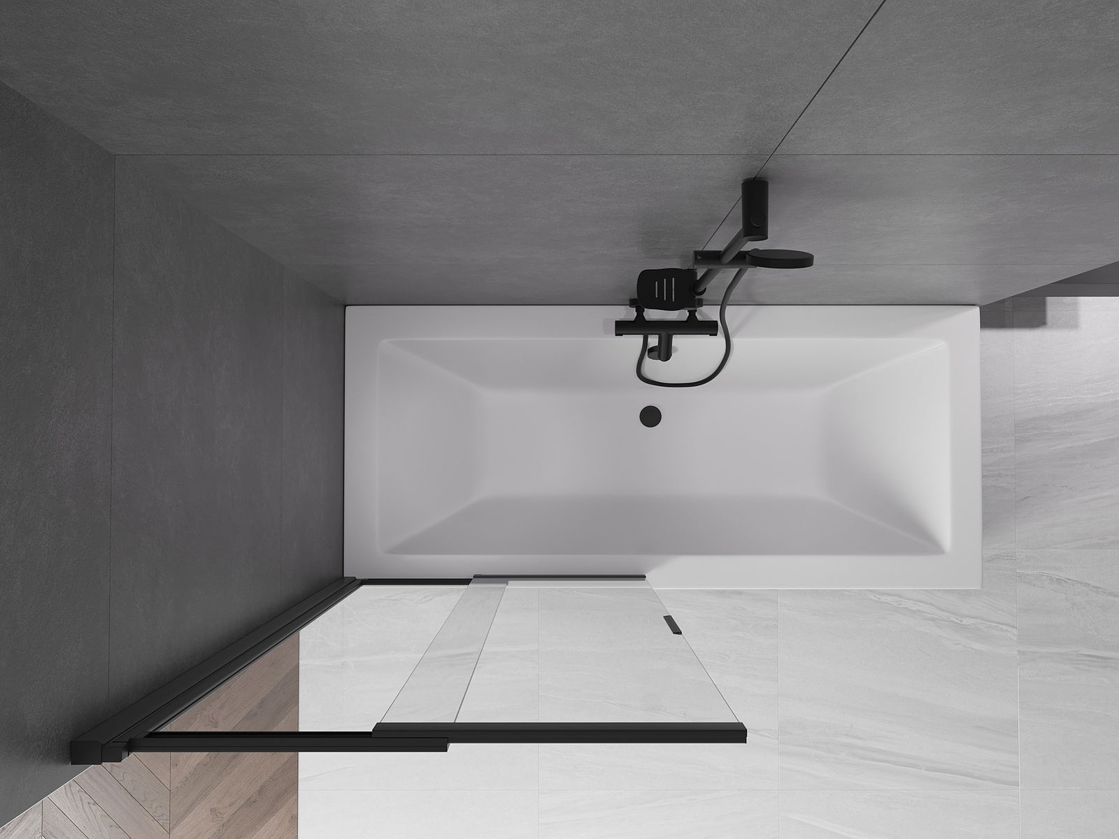 Dank dem universellen Montagesystem kann de Paravent je no Bedierfness op der rietser oder lénkser Säit montéiert ginn. Sou kanns de eng Dusch plangen, déi op de Raum vun der Buedzëmmer ugepasst ass.