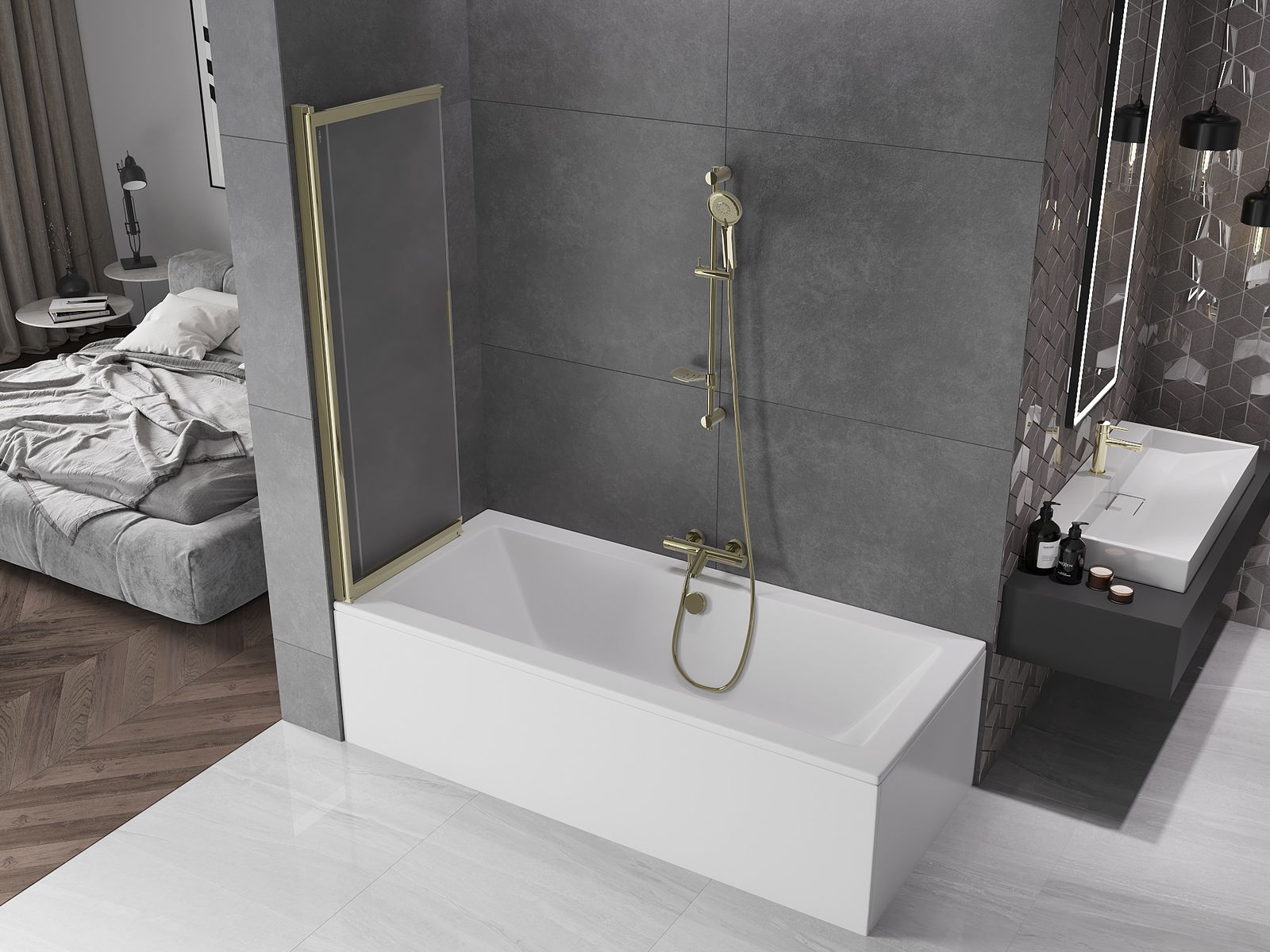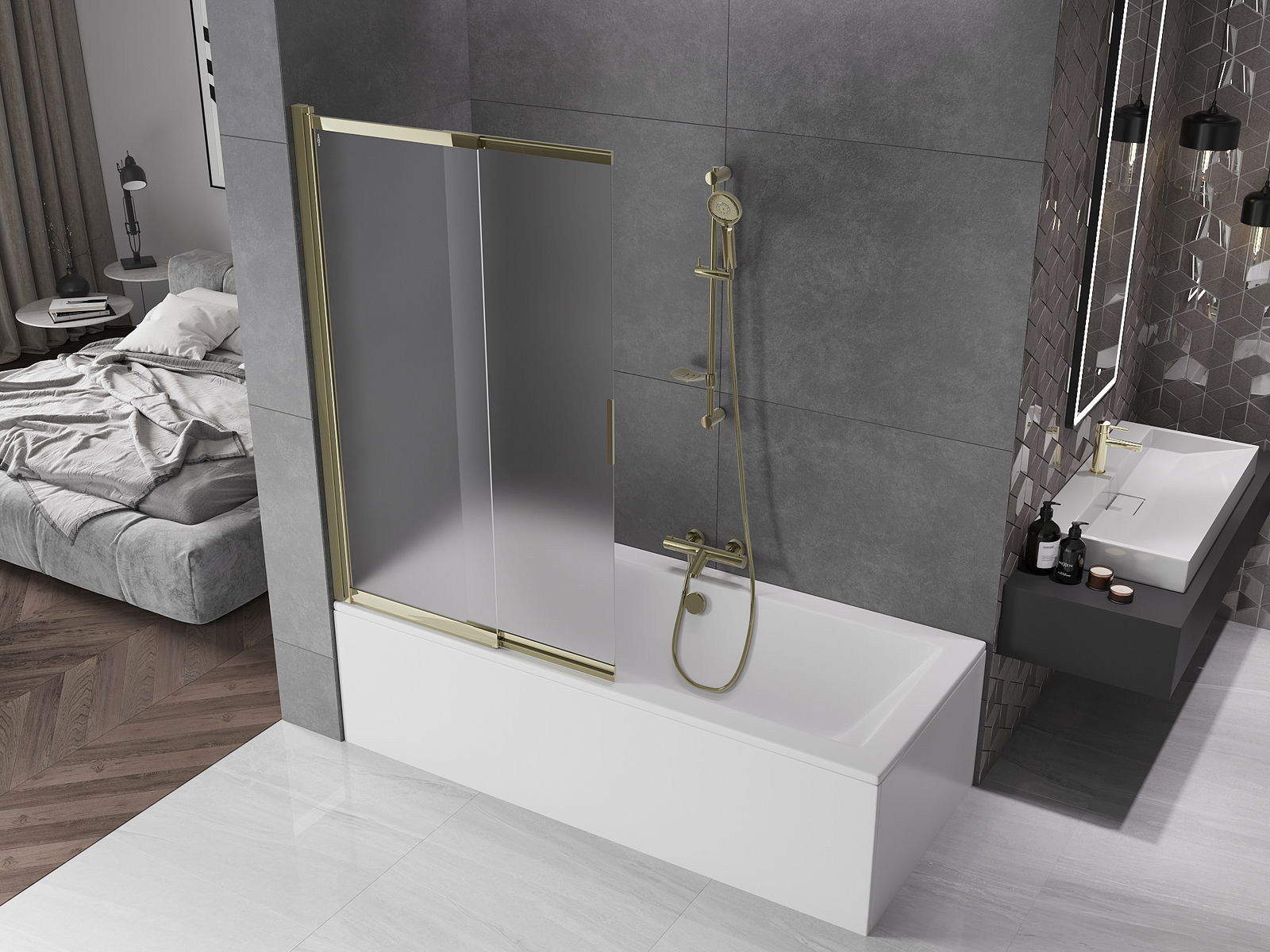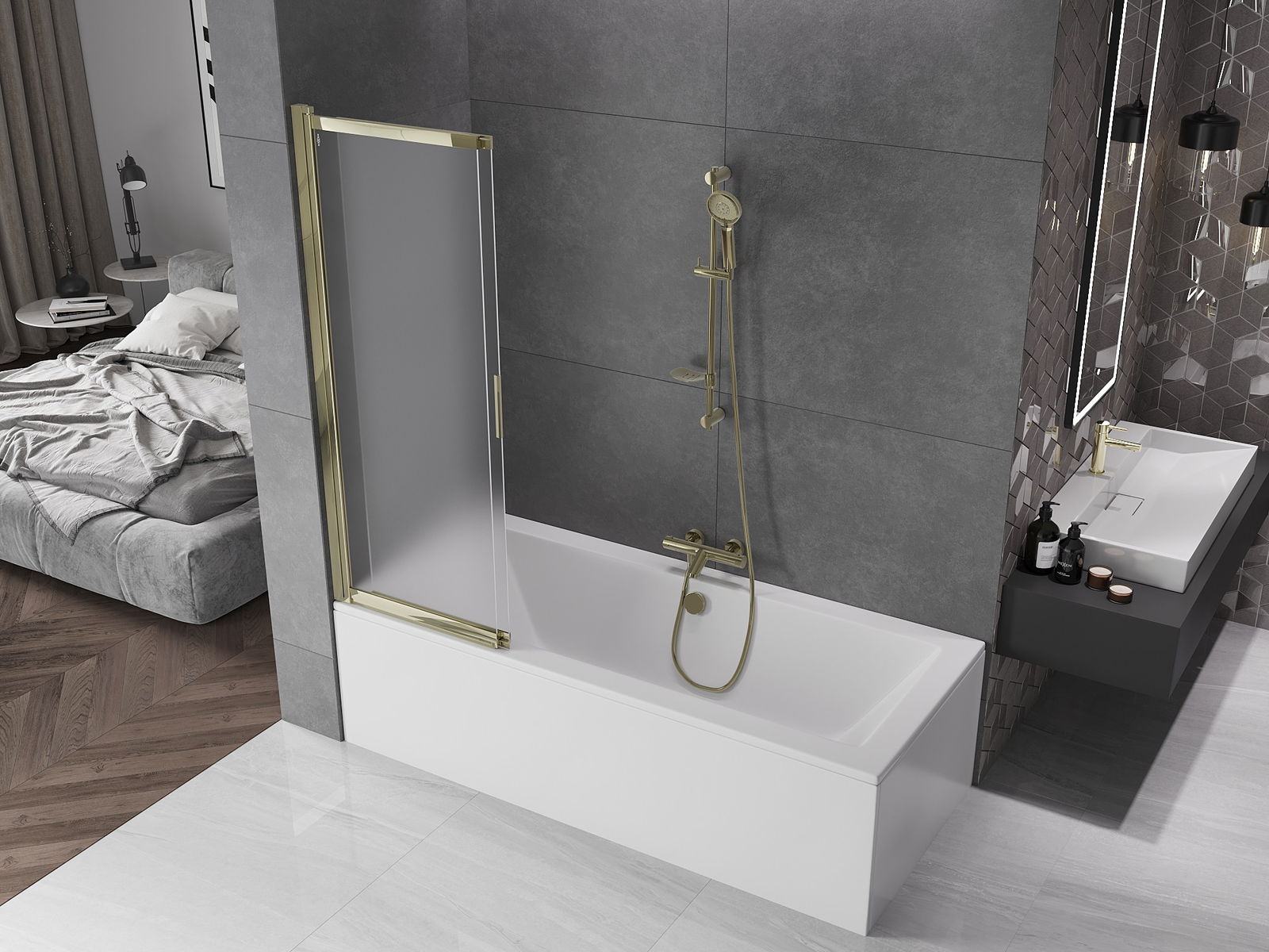Dank dem universellen Montagesystem kann de Paravent je no Bedierfness op der rietser oder lénkser Säit montéiert ginn. Sou kanns de eng Dusch plangen, déi op de Raum vun der Buedzëmmer ugepasst ass.