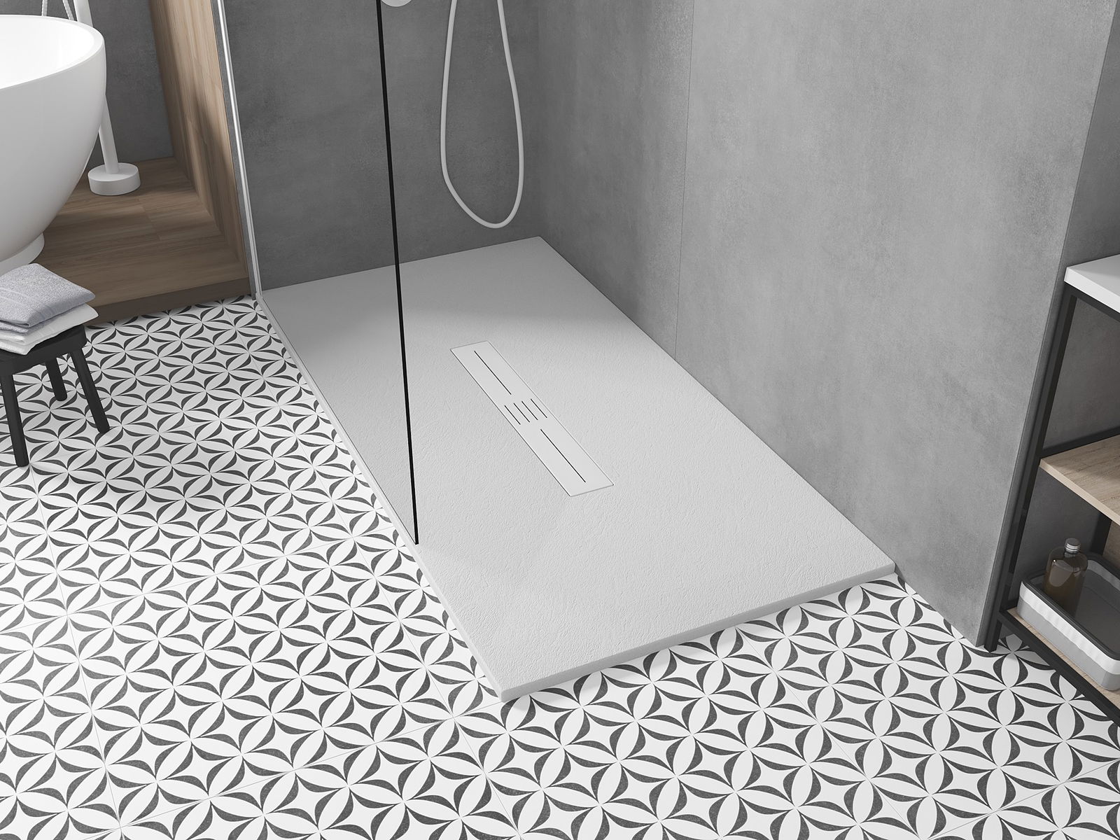 Déi geréng Héicht vum Douchebecken erlaabt eng traditionell Installatioun op de Buedem oder andeems se an de Buedem gesat gëtt, déi eng aussergewéinlech, eenheetlech Uewerfläch schaaft. D'Flexibilitéit vun der Installatioun erlaabt de Douchebecken un verschidden Interieurarrangementer unzepassen.