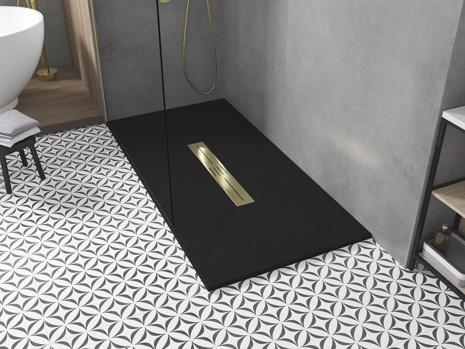 Déi geréng Héicht vum Douchebecken erlaabt eng traditionell Installatioun op de Buedem oder andeems se an de Buedem gesat gëtt, déi eng aussergewéinlech, eenheetlech Uewerfläch schaaft. D'Flexibilitéit vun der Installatioun erlaabt de Douchebecken un verschidden Interieurarrangementer unzepassen.