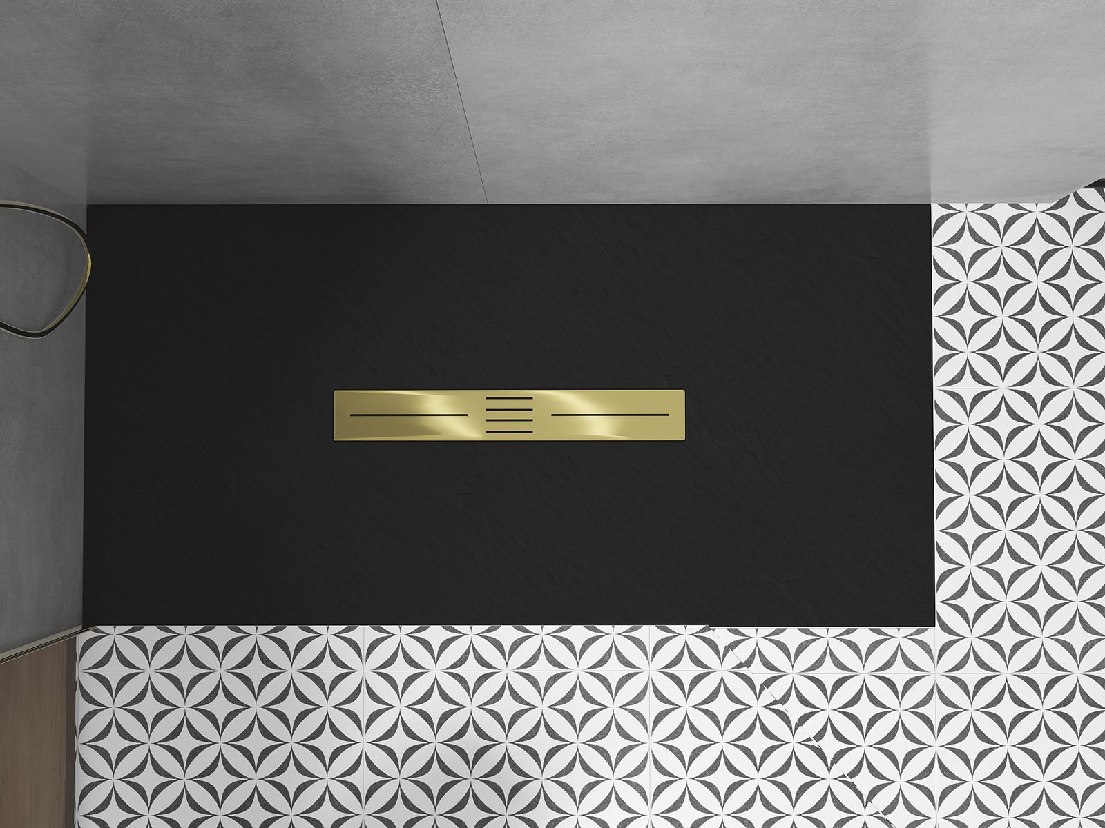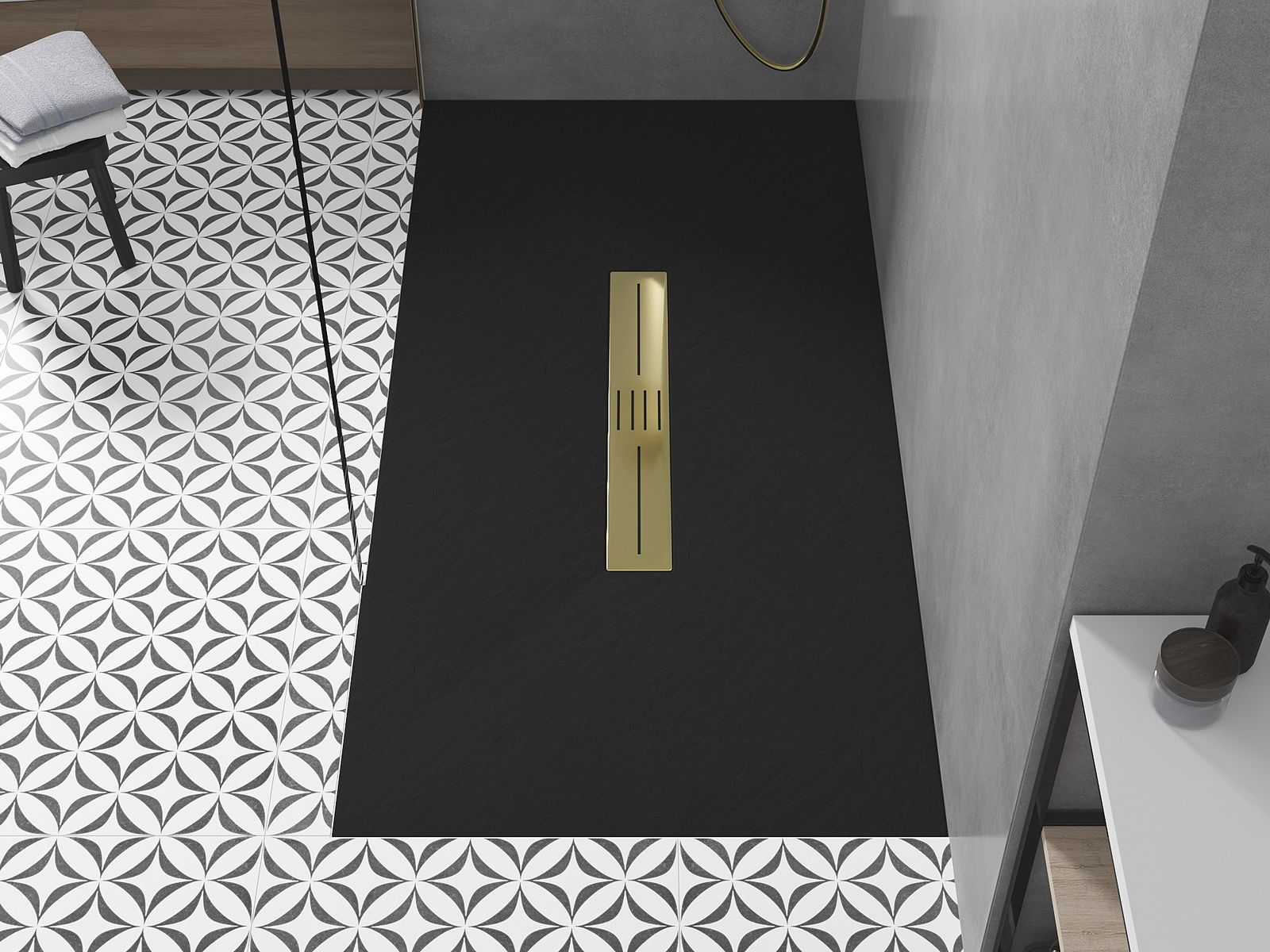 Déi geréng Héicht vum Douchebecken erlaabt eng traditionell Installatioun op de Buedem oder andeems se an de Buedem gesat gëtt, déi eng aussergewéinlech, eenheetlech Uewerfläch schaaft. D'Flexibilitéit vun der Installatioun erlaabt de Douchebecken un verschidden Interieurarrangementer unzepassen.