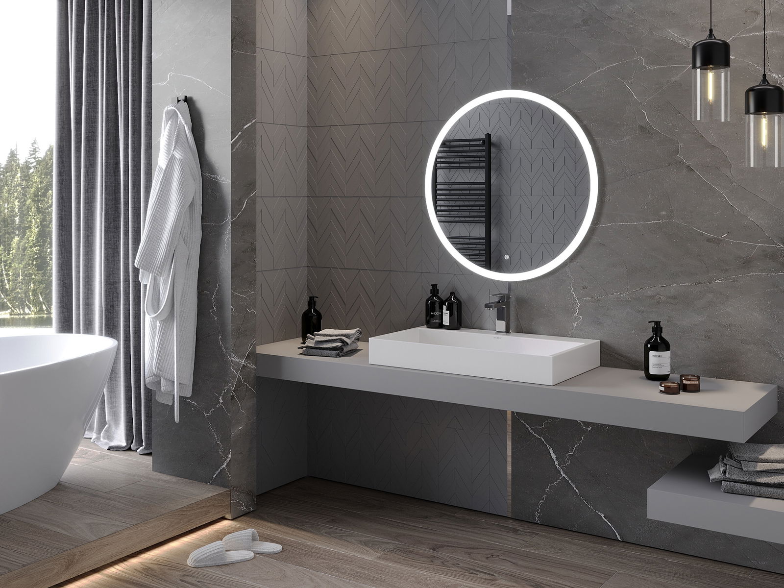 LED-Beliichtung beim Spigel ass e praktescht Element, dat den alldeegleche Fleeg erliichtert dank der Méiglechkeet fir d'Gesiicht ideal ze beliichten. D'Beliichtung gëtt dem Buedzëmmer en moderne Finish an ënnersträicht seng elegant Dekoratioun.