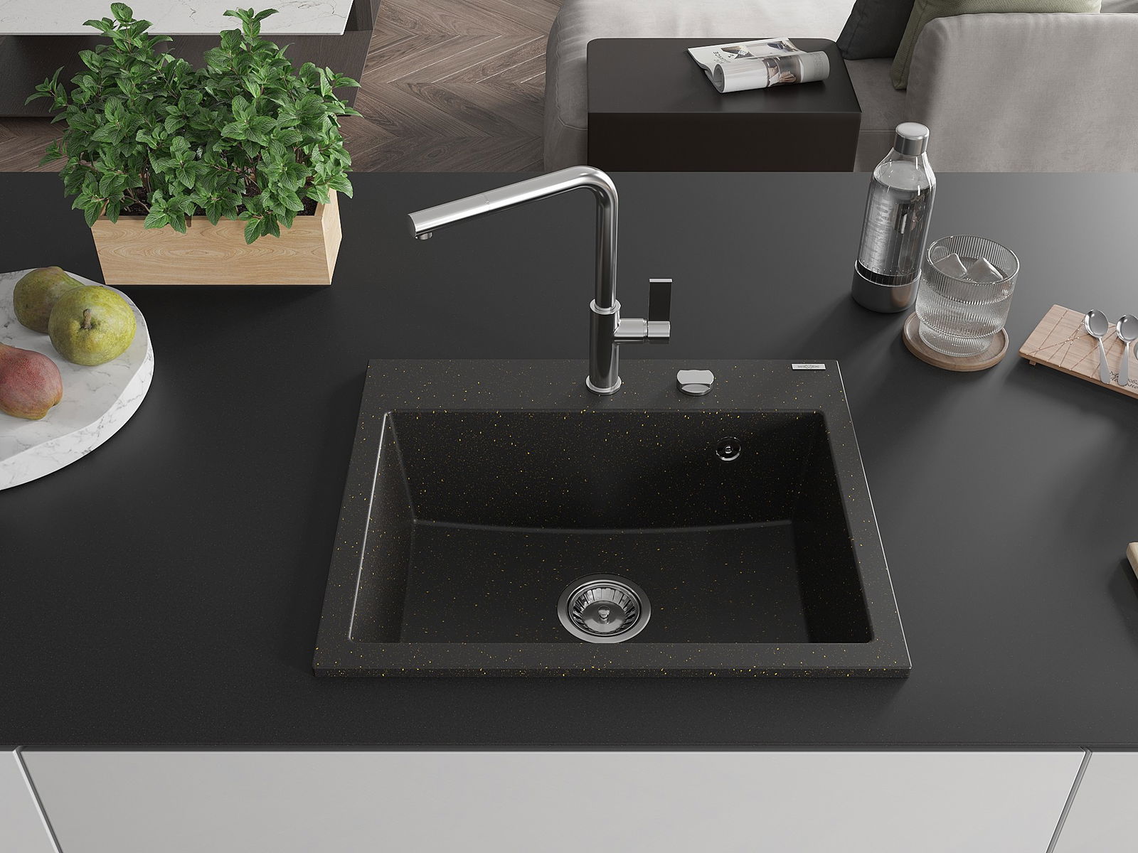 Mexen Oscar granitërdëppchen 1-Kummer 580 x 490 mm, schwaarz/gëllen Metallick, Siphon Chrom - 6519581000-75