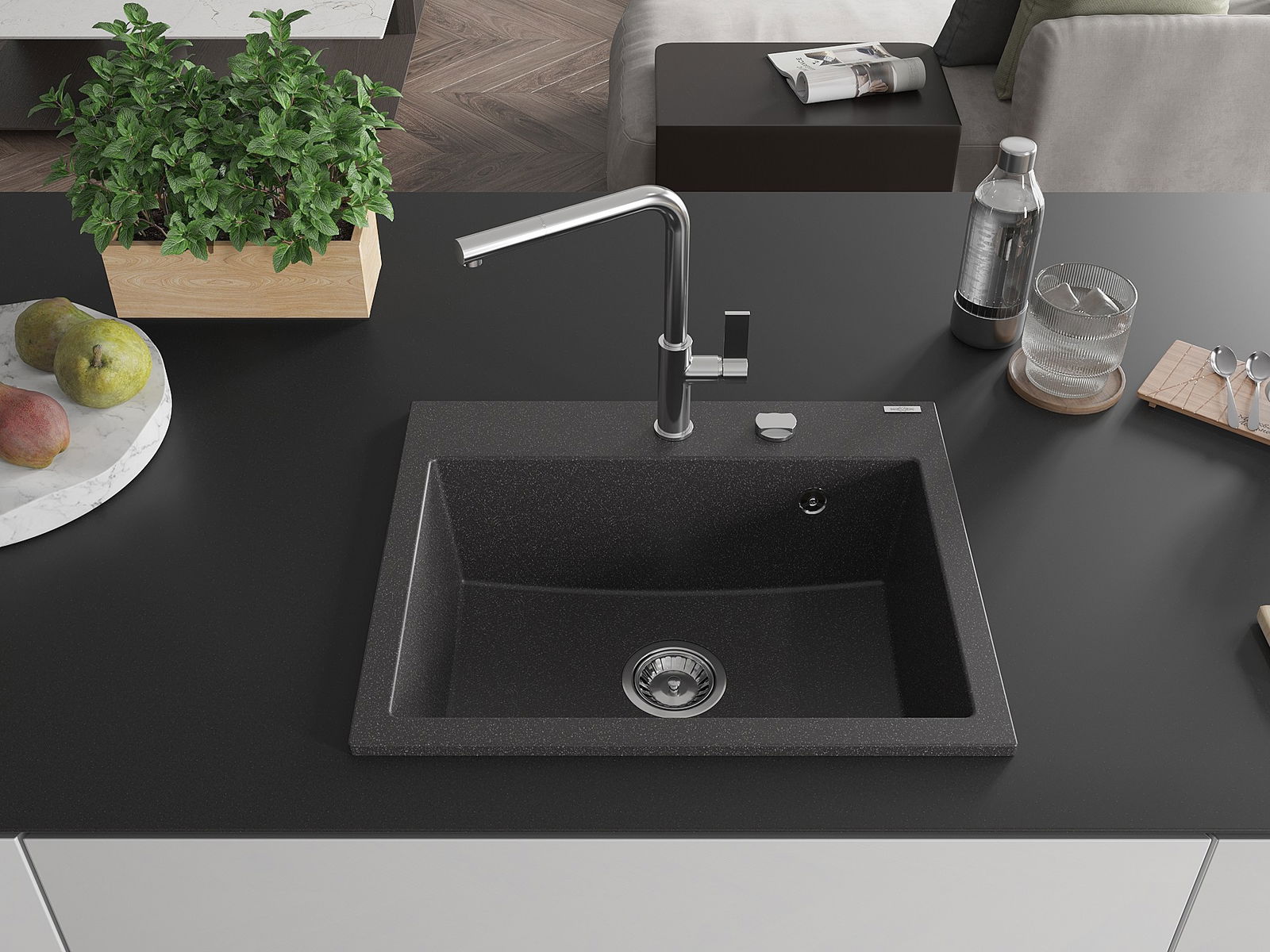 Mexen Oscar Granitspullbak 1-Komoreschen 580 x 490 mm, schwaarz gesprenkelt, Chrom Siphon - 6519581000-76