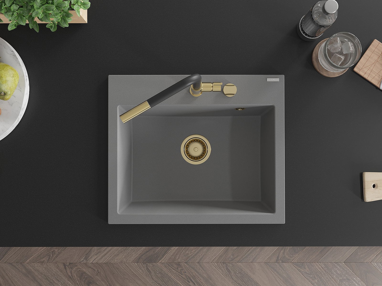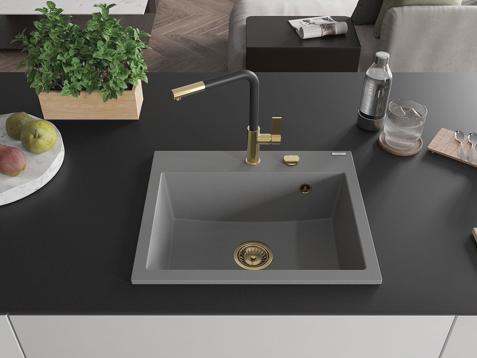 De Spullsteen huet e virgefraist Lach mat engem Duerchmiesser vu 35 mm fir selwer auszeschloen. Et kann ënner anerem genotzt ginn fir e Spender fir Flëssegkeet z'installéieren, deen d'Präsenz vu Plastikfläschen an der Kichen eliminéiert an hir en elegante Finish gëtt.