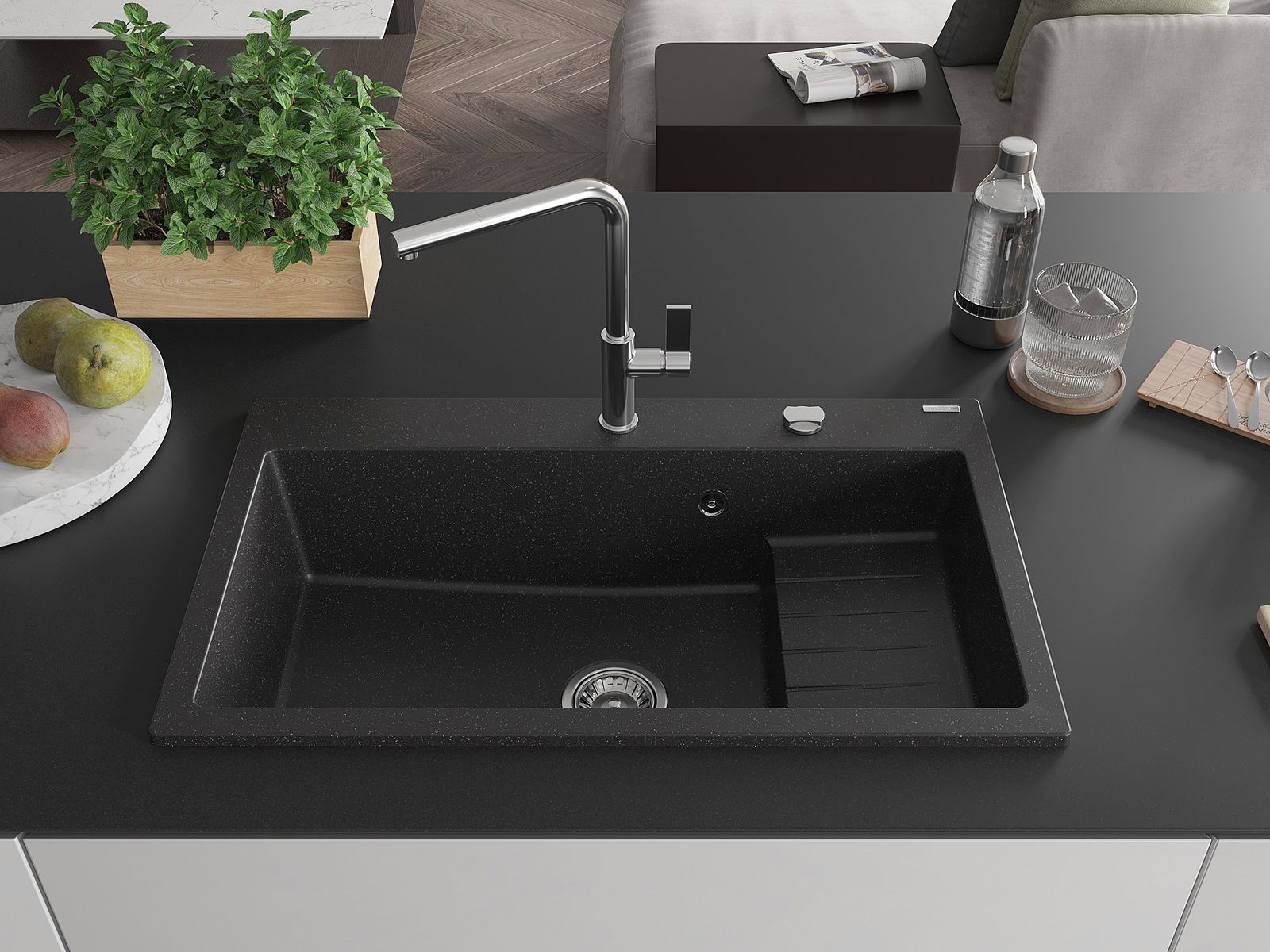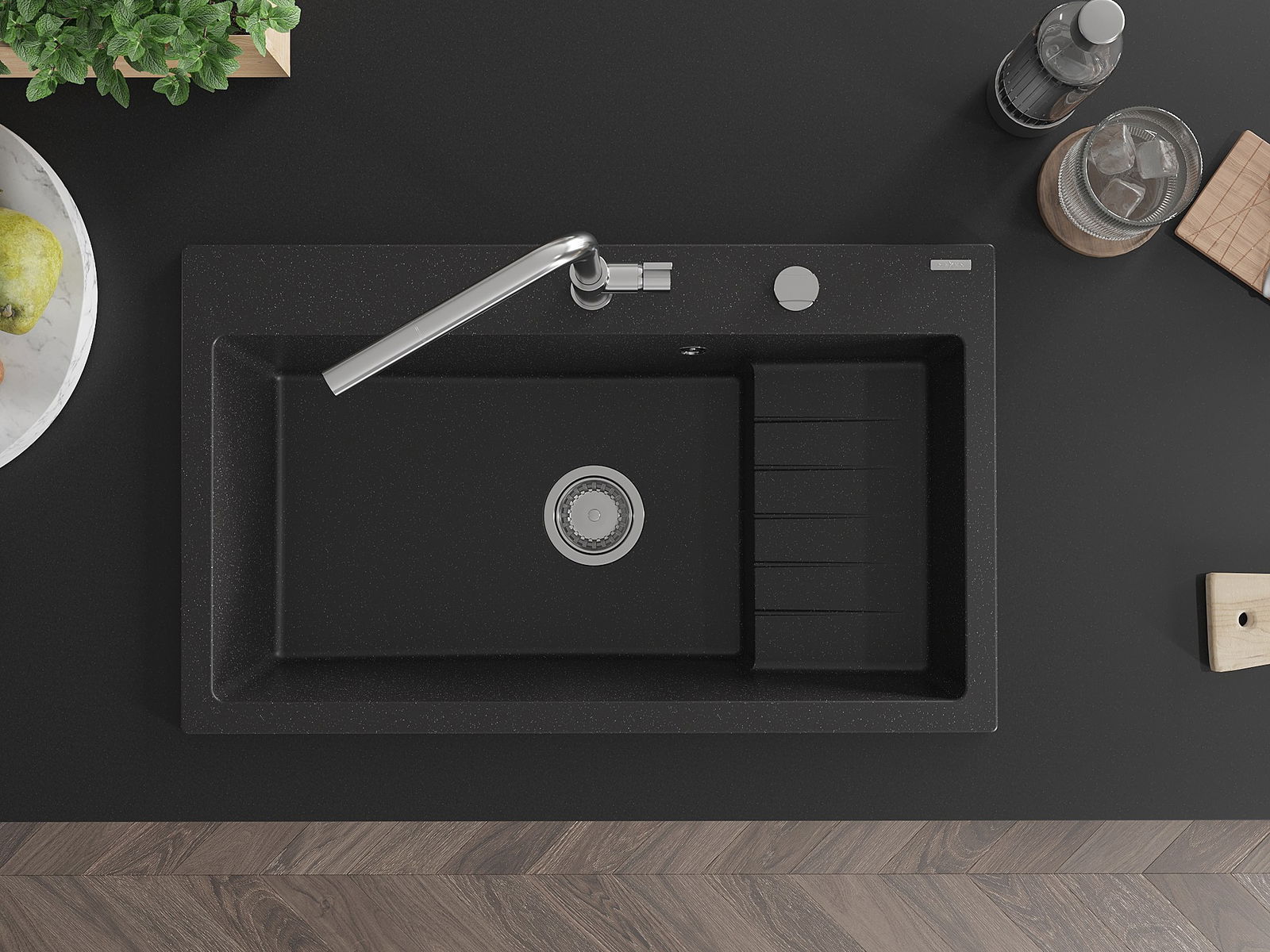 De Spullsteen huet e virgefraist Lach mat engem Duerchmiesser vu 35 mm fir selwer auszeschloen. Et kann ënner anerem genotzt ginn fir e Spender fir Flëssegkeet z'installéieren, deen d'Präsenz vu Plastikfläschen an der Kichen eliminéiert an hir en elegante Finish gëtt.
