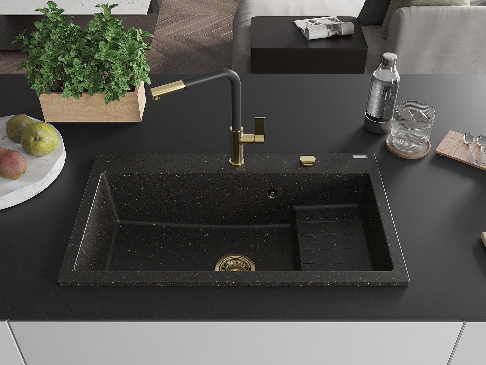 Mexen Omar Granit-Eenzelschëff 1-Kummer 800 x 480 mm, schwaarz/gëllene Metalik, gëllene Siphon - 6520801005-75-G
