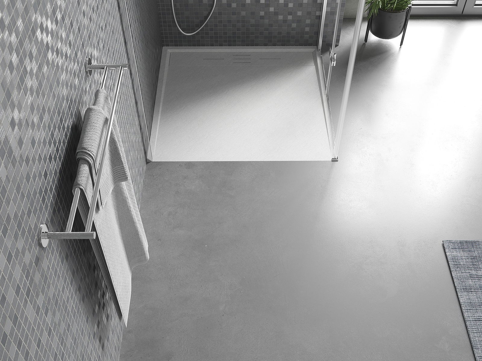 Déi geréng Héicht vum Douchebecken erlaabt eng traditionell Installatioun op de Buedem oder andeems se an de Buedem gesat gëtt, déi eng aussergewéinlech, eenheetlech Uewerfläch schaaft. D'Flexibilitéit vun der Installatioun erlaabt de Douchebecken un verschidden Interieurarrangementer unzepassen.