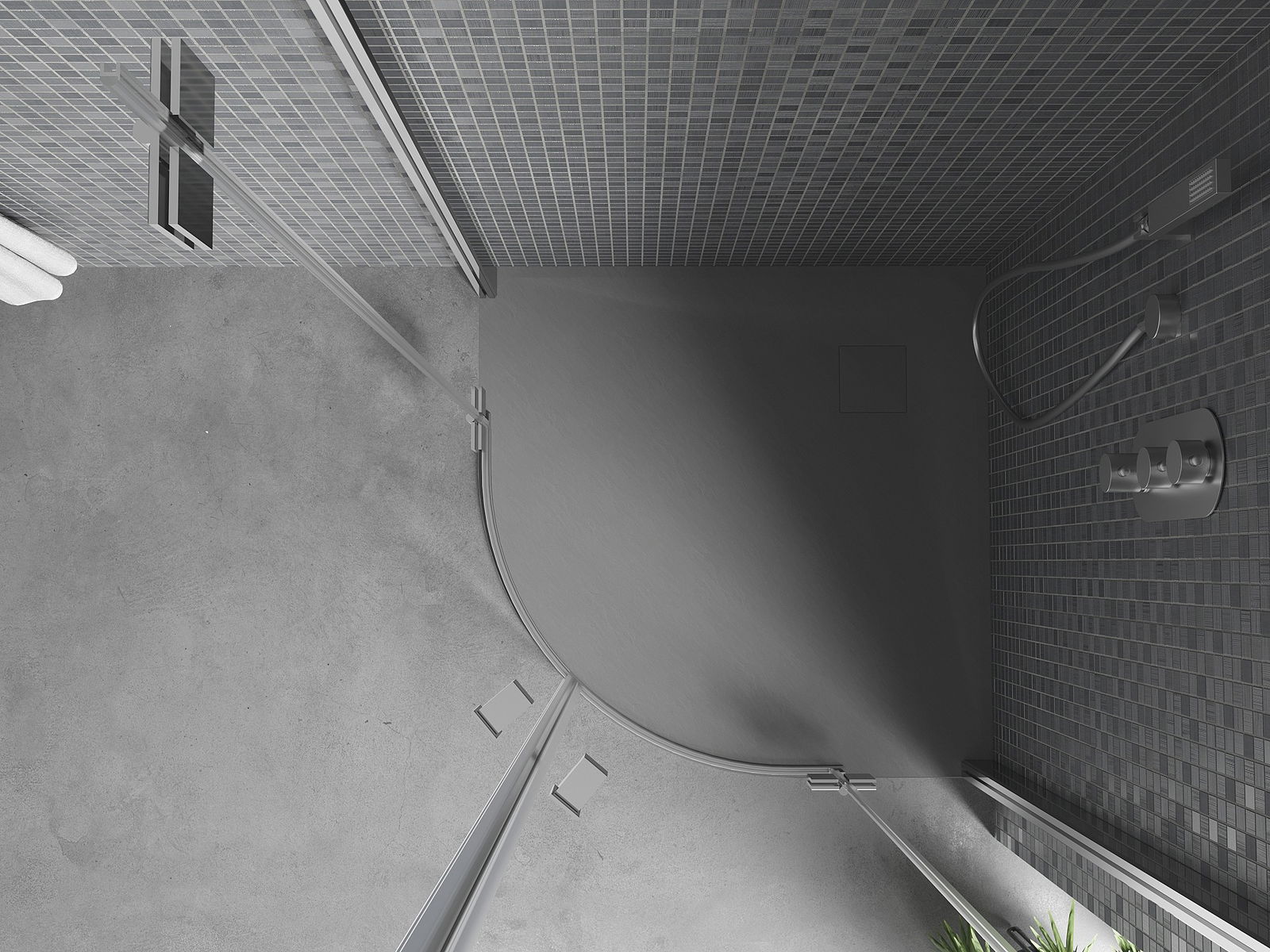 D'Uewerfläch vun der Duschkabinn erënnert un d'Struktur vun engem Steen. Et ass eng aussergewéinlech Kombinatioun vun natierlechem Ausgesi mat moderner Innenarchitektur. Et füügt Charakter derzou, ënnersträicht d'Ästhetik an d'Eleganz vum Buedzëmmerdesign a begeeschtert mat senger Form.