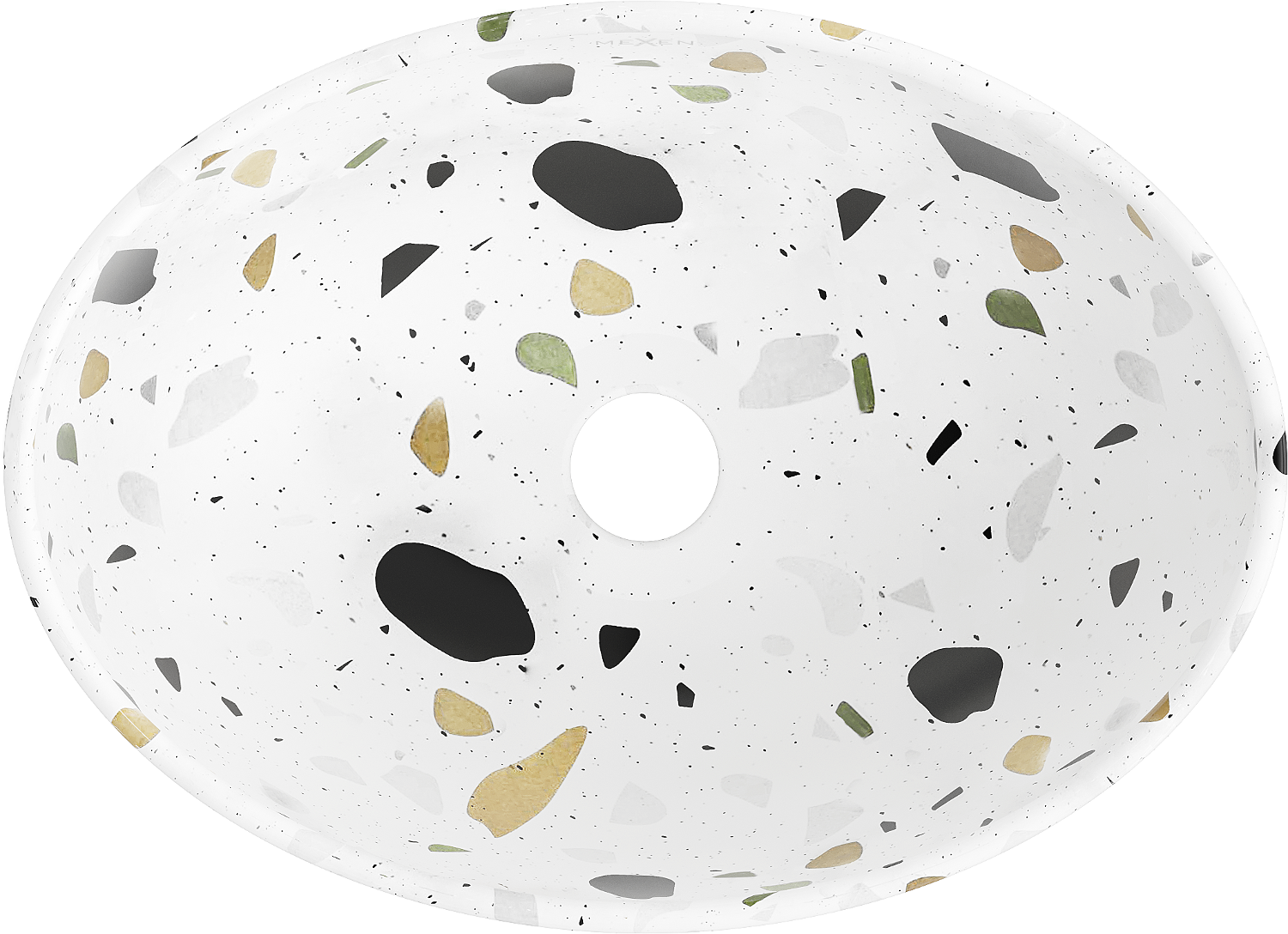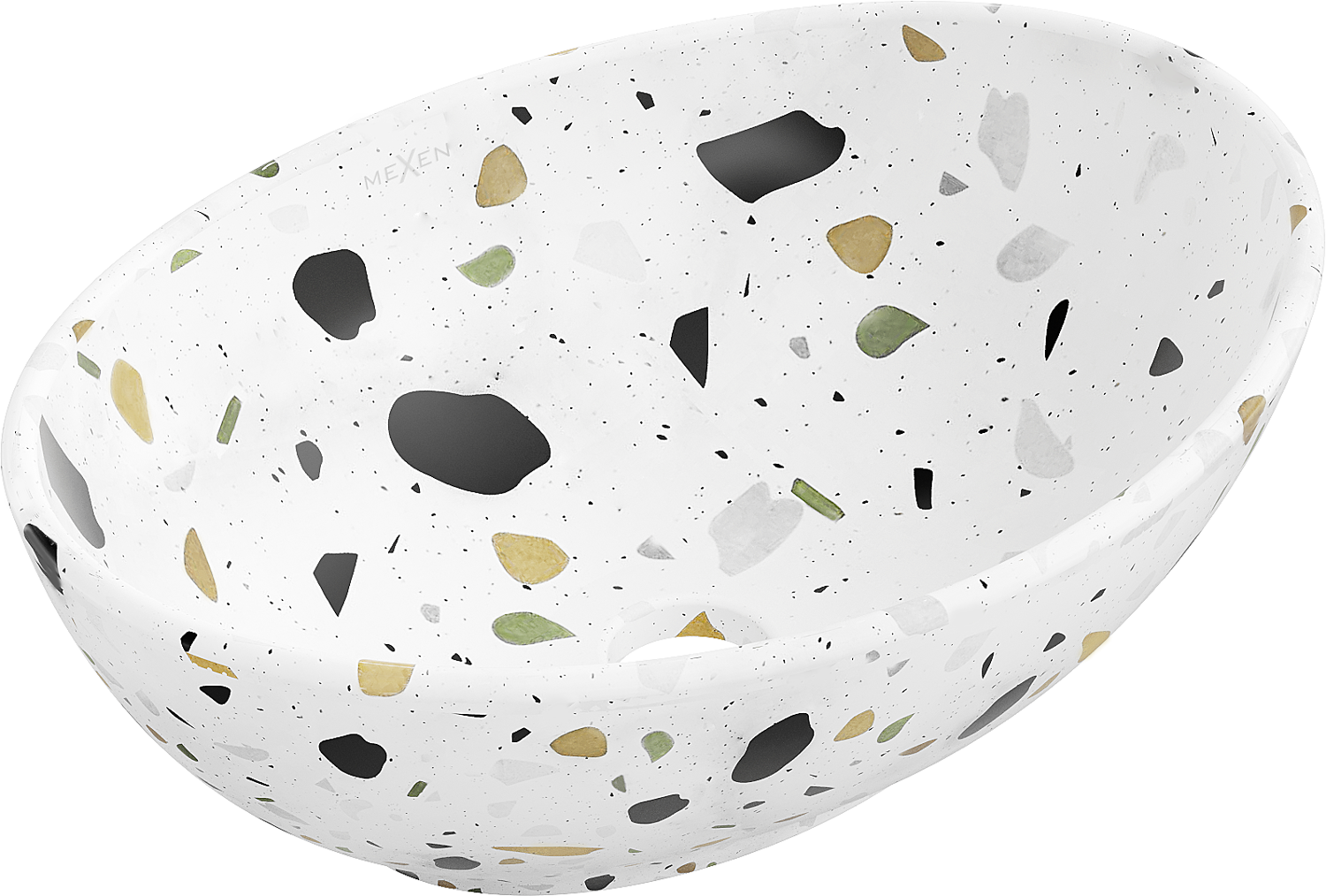 Mexen Elza ass en elegante ëmgelegeten Handwäschbecken mat den Dimensiounen 40,5 x 33 cm, gemaach aus héichwäerteger Sanitärkeramik. Säi wäisse Terrazo Stee gëtt all Buedzëmmer e modernen a stilvollen Uschäin. D'Handwäschbecken huet eng oval Form a glat, glänzend Uewerfläch, wat d'Botzen erliichtert. Mat engem Mangel un Lächer fir Krunnen an Iwwerleefer passt et zum minimalistesch Design a verschidden Aarrangemente. Dank der spezieller Schutzbeschichtung ass et laanglieweg an ofschierbar resistent.