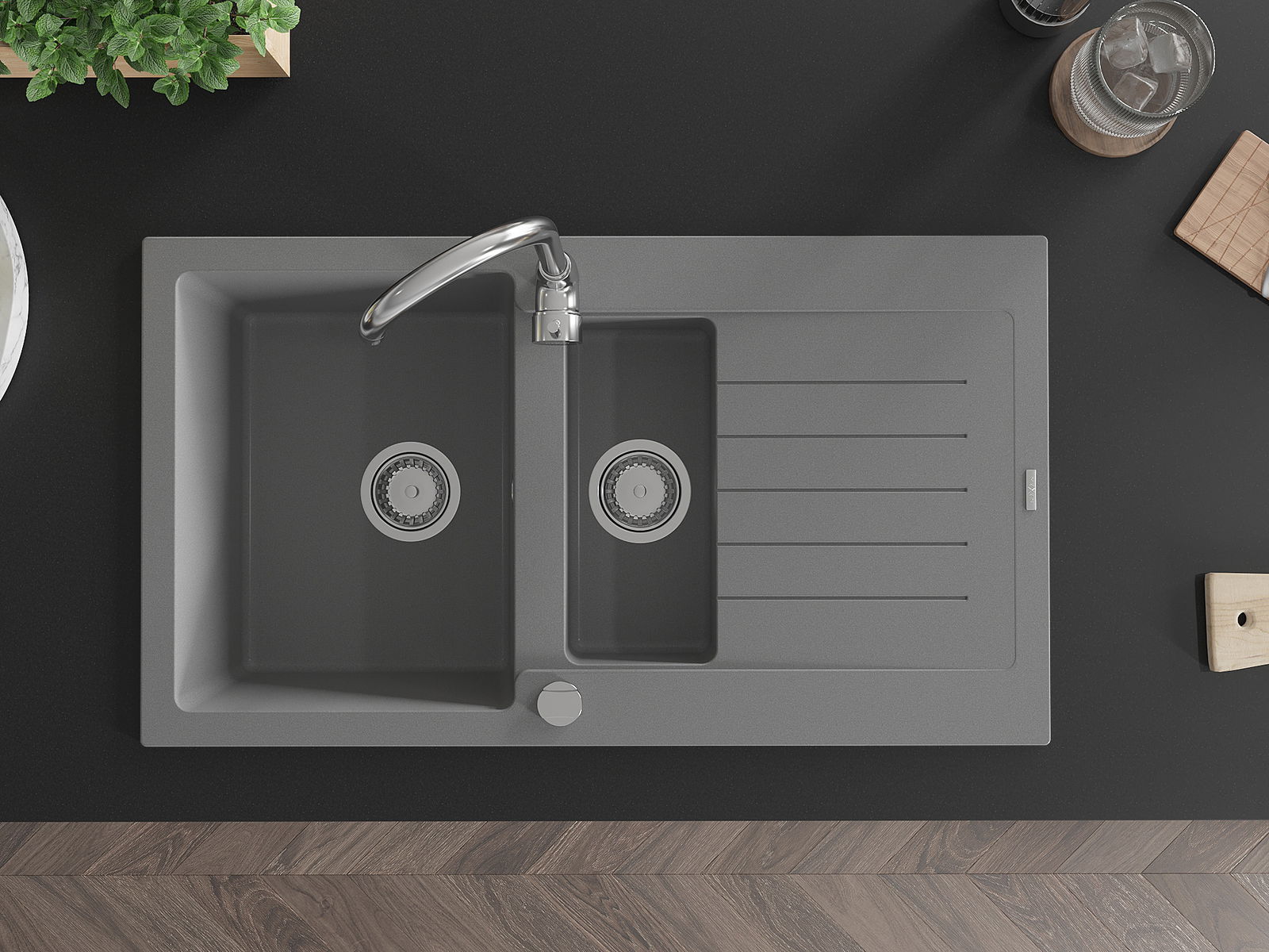 Den Ëmwäschbecken ass aus héichwäertege Granit gemaach. Et stellt eng elegant awer virun allem praktesch Ergänzung fir all Kichen duer, onofhängeg vun hirem Stil. Déi héich Qualitéit an Haltbarkeet vum Granit suergen fir méi järelaang Benotzung.