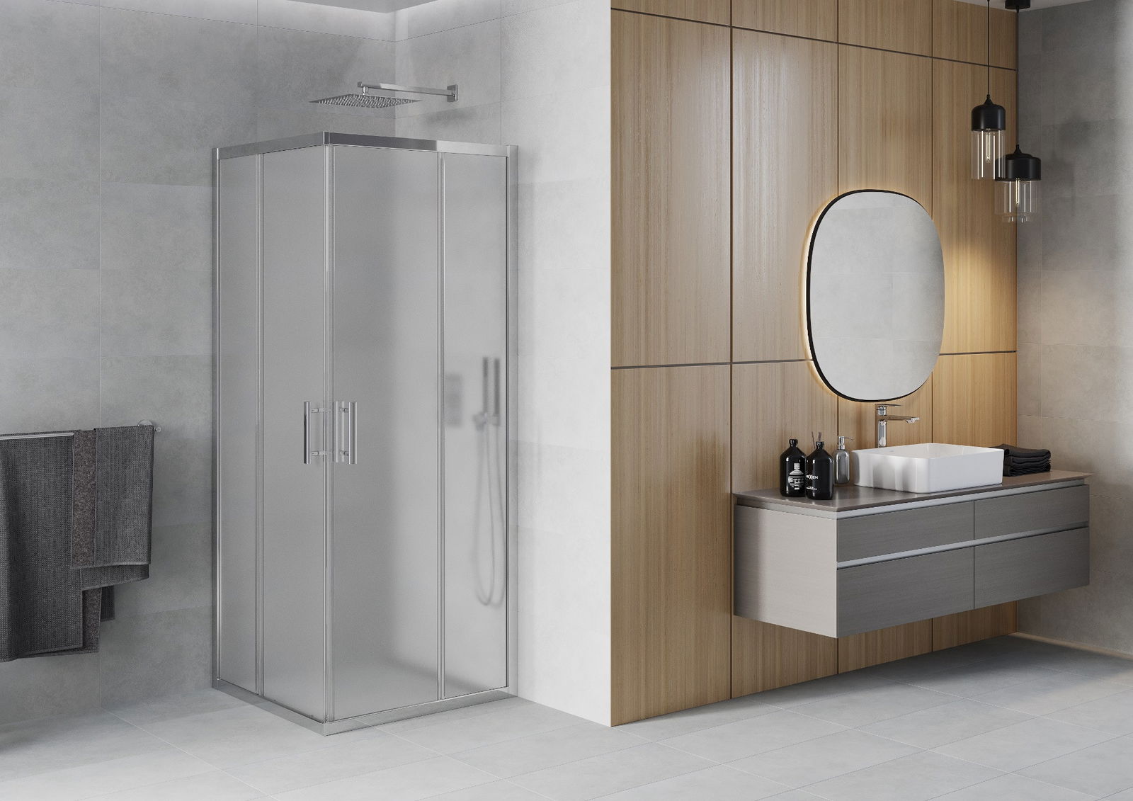 Schiebetüren beweegen sech op speziellen Schinnen a brauchen net zousätzlech Raum fir se opzemaachen, dofir si se gëeegent fir méi kleng Buedzëmmeren. Dank den duebele Rullen aus haltbarem Kunststoff ass hiren Beweegung fléissend.