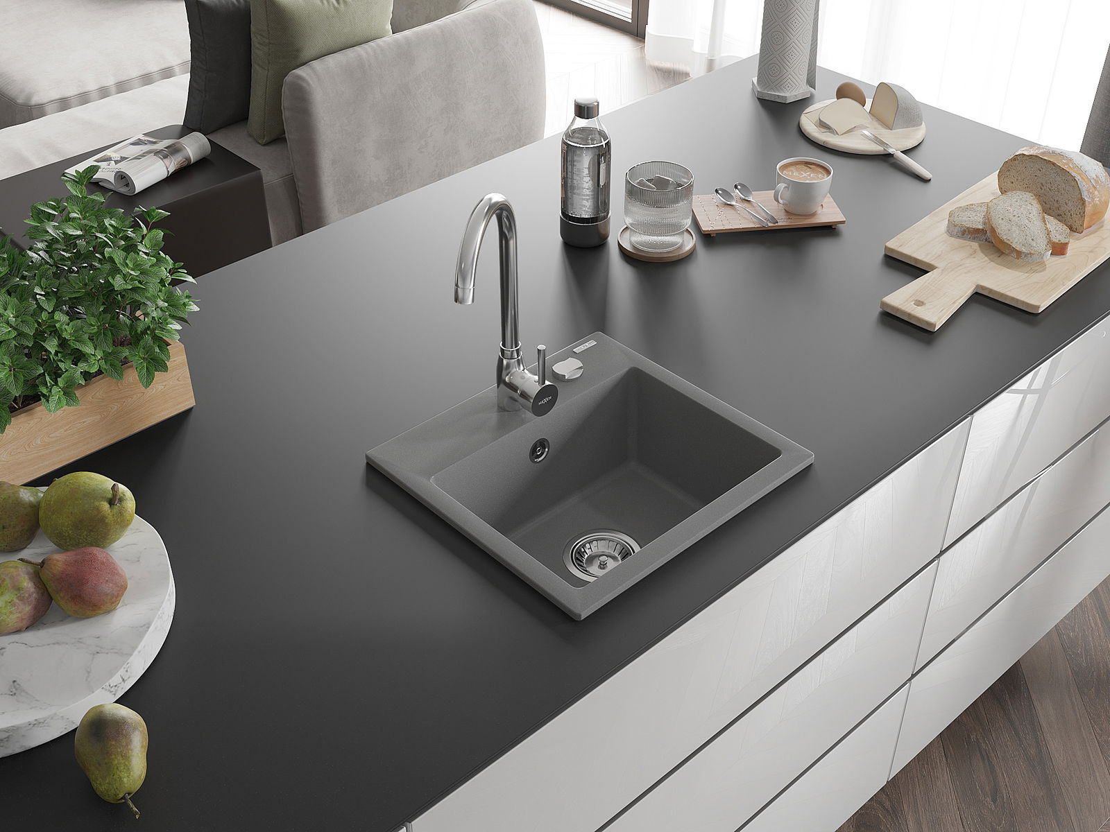 De Spullsteen huet e virgefraist Lach mat engem Duerchmiesser vu 35 mm fir selwer auszeschloen. Et kann ënner anerem genotzt ginn fir e Spender fir Flëssegkeet z'installéieren, deen d'Präsenz vu Plastikfläschen an der Kichen eliminéiert an hir en elegante Finish gëtt.