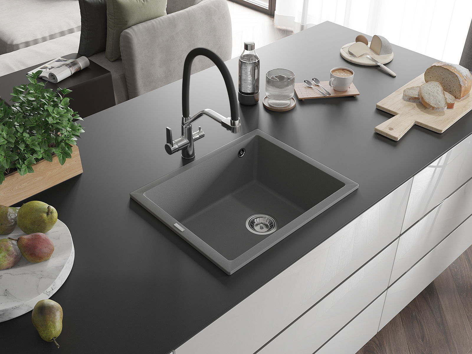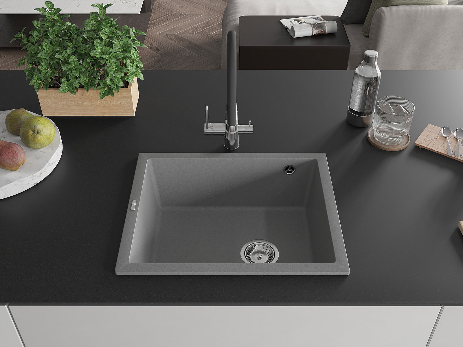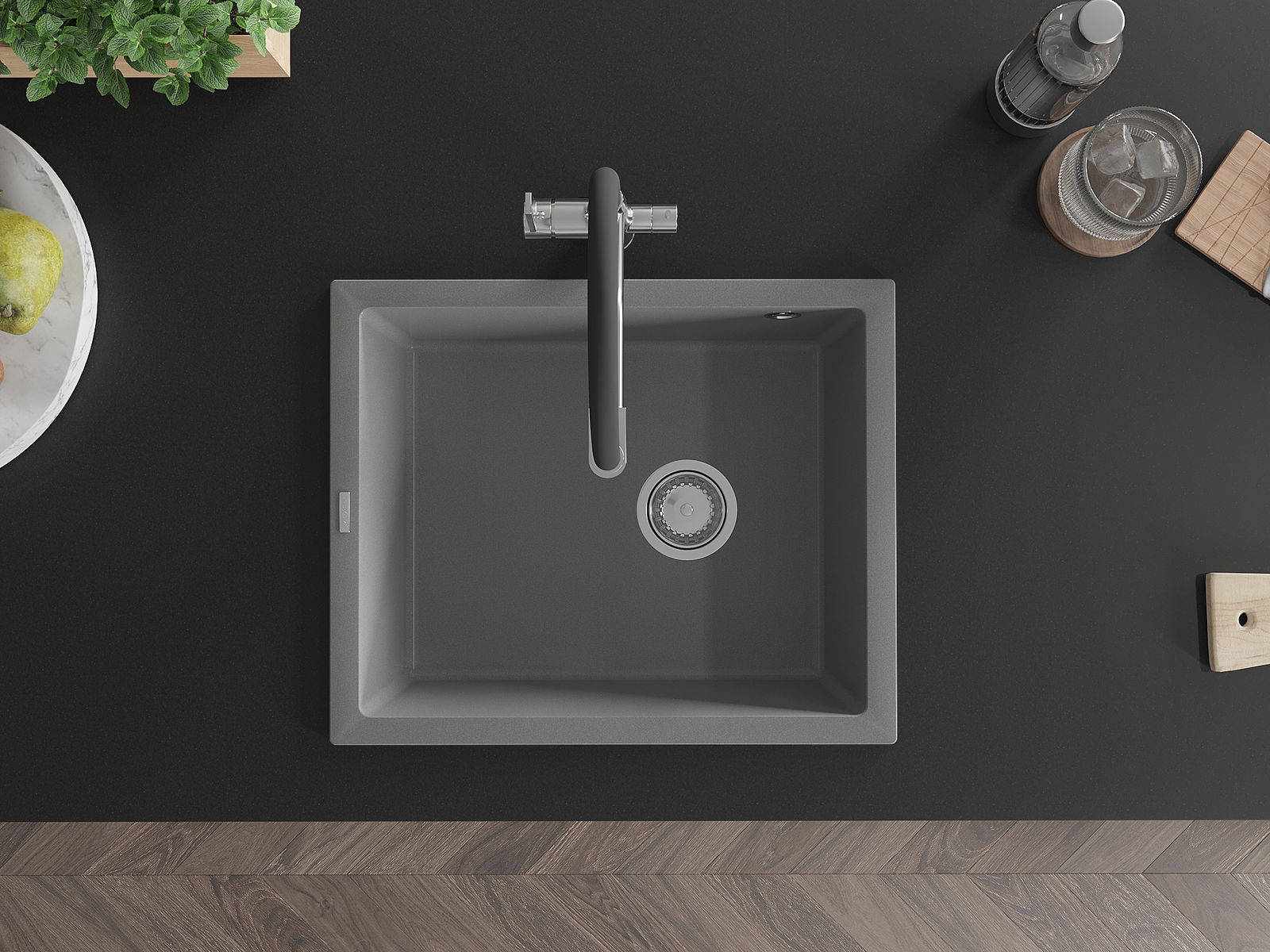 Den Ëmwäschbecken ass aus héichwäertege Granit gemaach. Et stellt eng elegant awer virun allem praktesch Ergänzung fir all Kichen duer, onofhängeg vun hirem Stil. Déi héich Qualitéit an Haltbarkeet vum Granit suergen fir méi järelaang Benotzung.