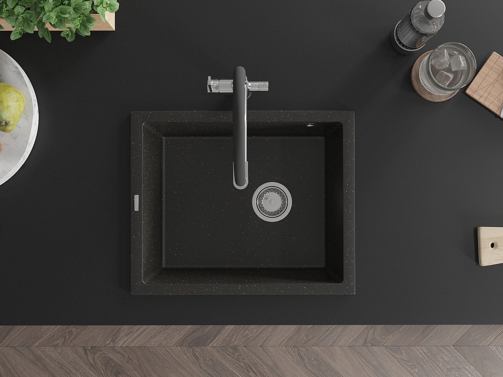 Mexen Pedro Granitspullt ass 1er-Sektioun 560 x 460 mm, schwaarz/goldene Metallik, chrom Siphon - 6508561000-75