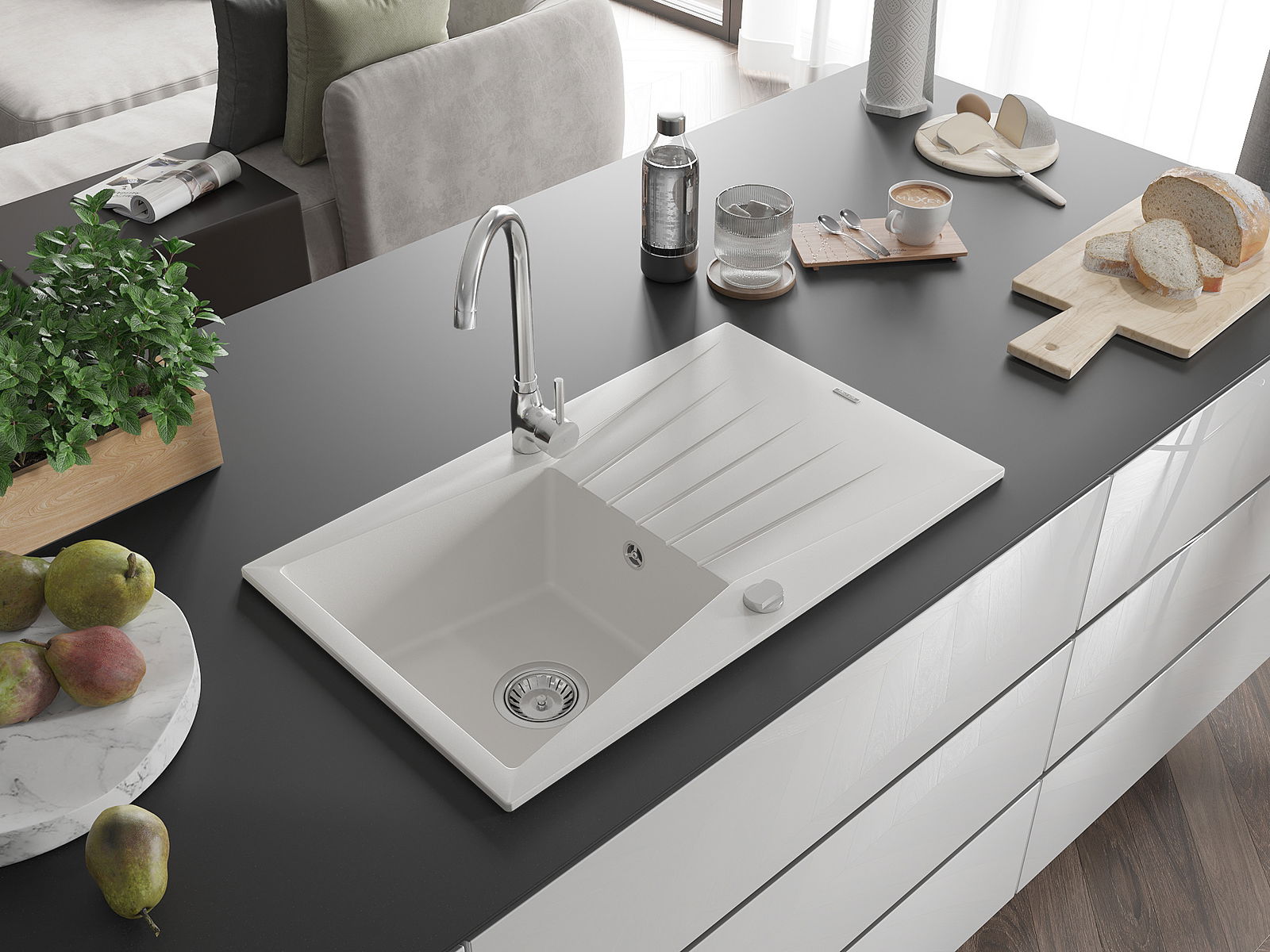 D'Uewerfläch vum Spullstee ass fleck- a verfärbungsresistent, wat se einfach ze botzen mécht an hir Faarf iwwer eng laang Zäit vum Gebrauch behalen léisst. Esthetesch an praktesch Ergänzung fir all Kichen.