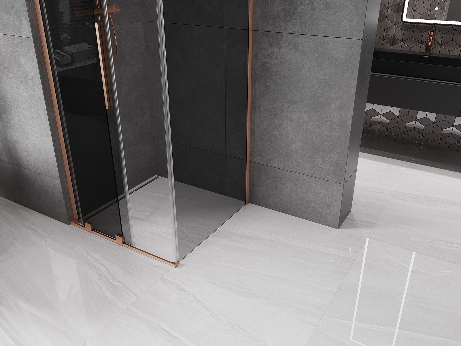 Mexen Velar L schibbare Duschkabinn 110 x 110 cm, Grafit, gebierzt Mëssing - 871-110-110-43-65