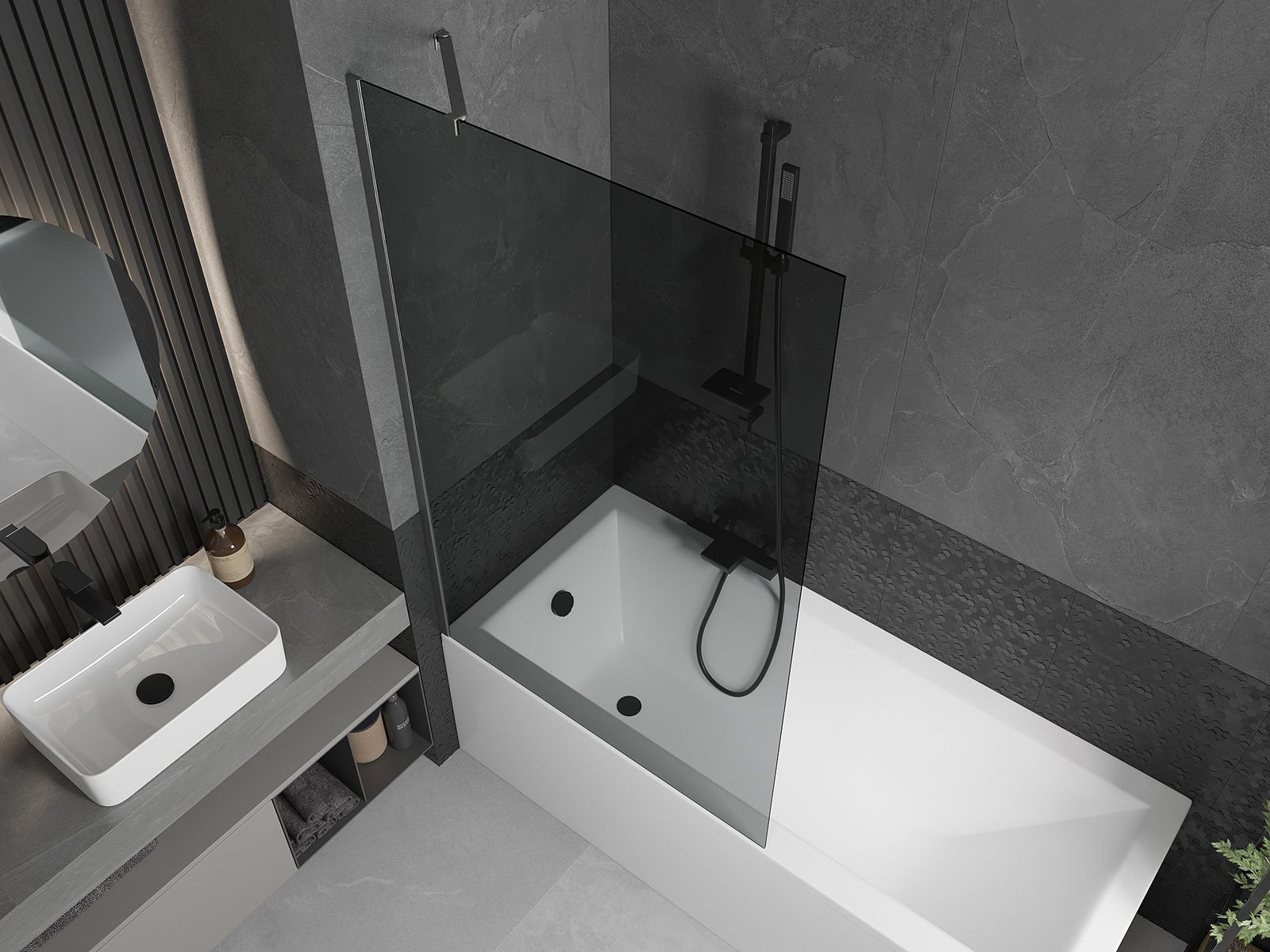Dank dem universellen Montagesystem kann de Paravent je no Bedierfness op der rietser oder lénkser Säit montéiert ginn. Sou kanns de eng Dusch plangen, déi op de Raum vun der Buedzëmmer ugepasst ass.