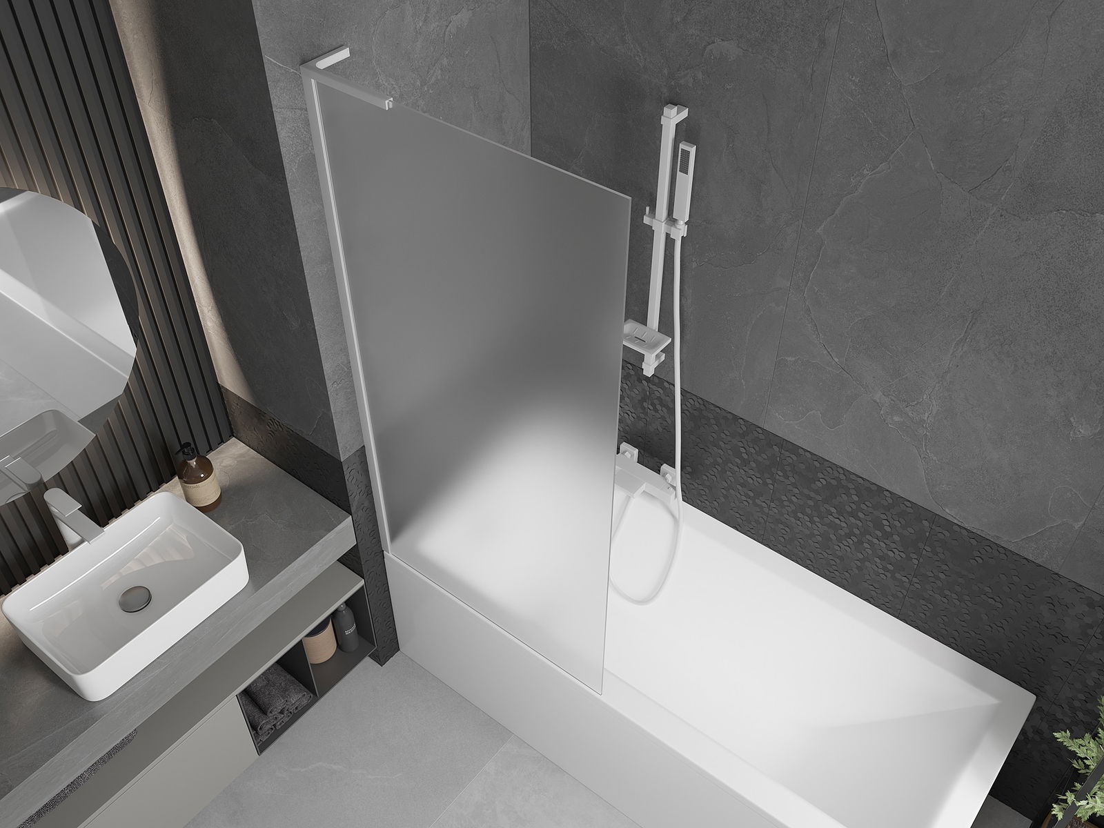 Dank dem universellen Montagesystem kann de Paravent je no Bedierfness op der rietser oder lénkser Säit montéiert ginn. Sou kanns de eng Dusch plangen, déi op de Raum vun der Buedzëmmer ugepasst ass.