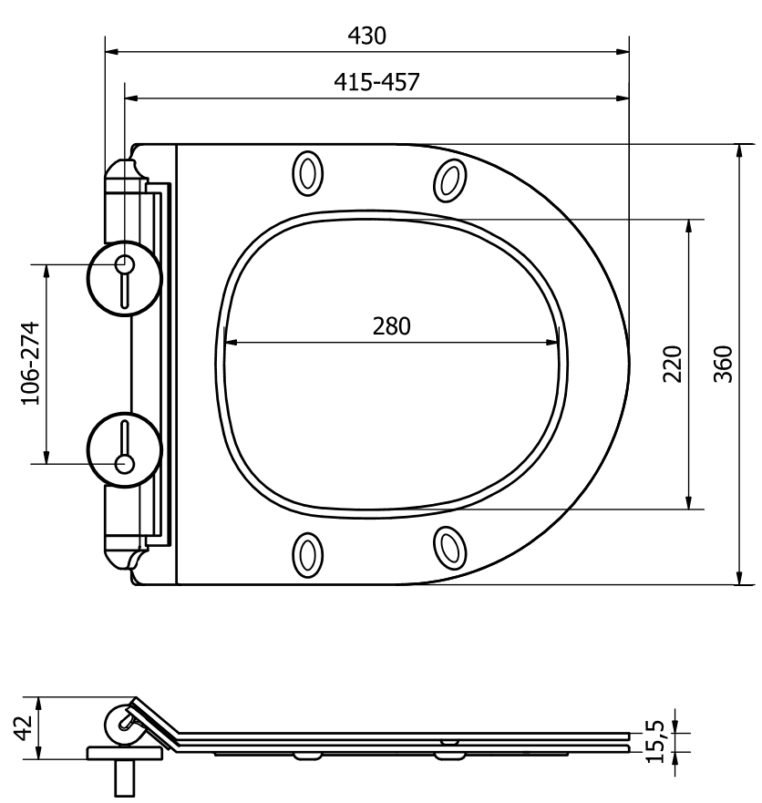 An der Zeen sinn zolidd Metall Scharnieren, déi eng stabil Befestegung vum Sëtz um WC-Bol garantéieren. Et ass eng praktesch Léisung, déi et erméiglecht, de Sëtz einfach un d'Form an d'Dimensioune vun der Toilette unzepassen, fir Komfort am Gebrauch ze garantéieren.