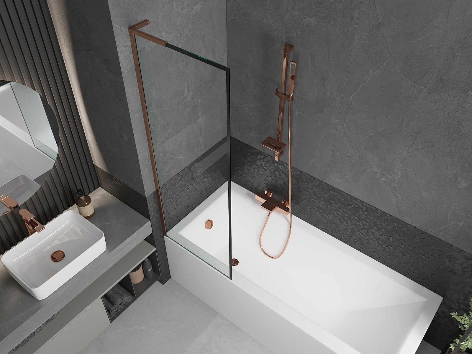 Dank dem universellen Montagesystem kann de Paravent je no Bedierfness op der rietser oder lénkser Säit montéiert ginn. Sou kanns de eng Dusch plangen, déi op de Raum vun der Buedzëmmer ugepasst ass.