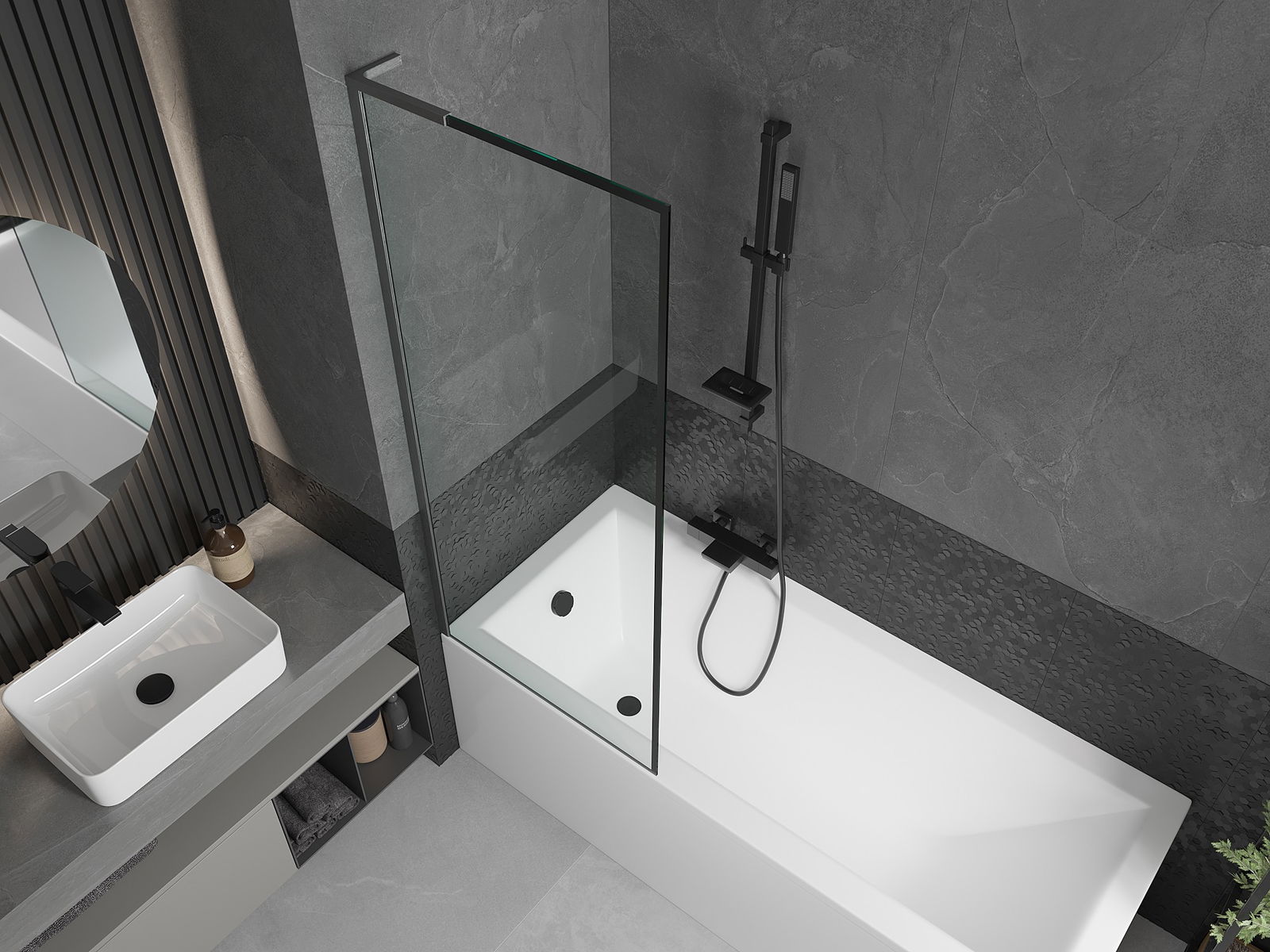 Dank dem universellen Montagesystem kann de Paravent je no Bedierfness op der rietser oder lénkser Säit montéiert ginn. Sou kanns de eng Dusch plangen, déi op de Raum vun der Buedzëmmer ugepasst ass.