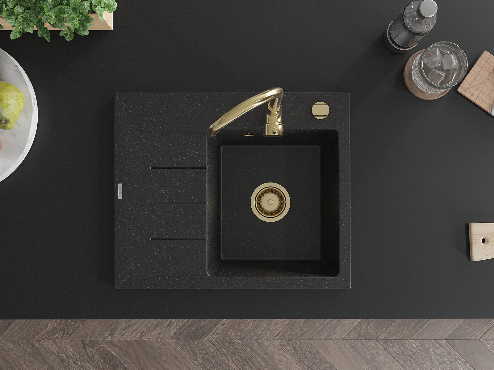 De Spullsteen huet e virgefraist Lach mat engem Duerchmiesser vu 35 mm fir selwer auszeschloen. Et kann ënner anerem genotzt ginn fir e Spender fir Flëssegkeet z'installéieren, deen d'Präsenz vu Plastikfläschen an der Kichen eliminéiert an hir en elegante Finish gëtt.
