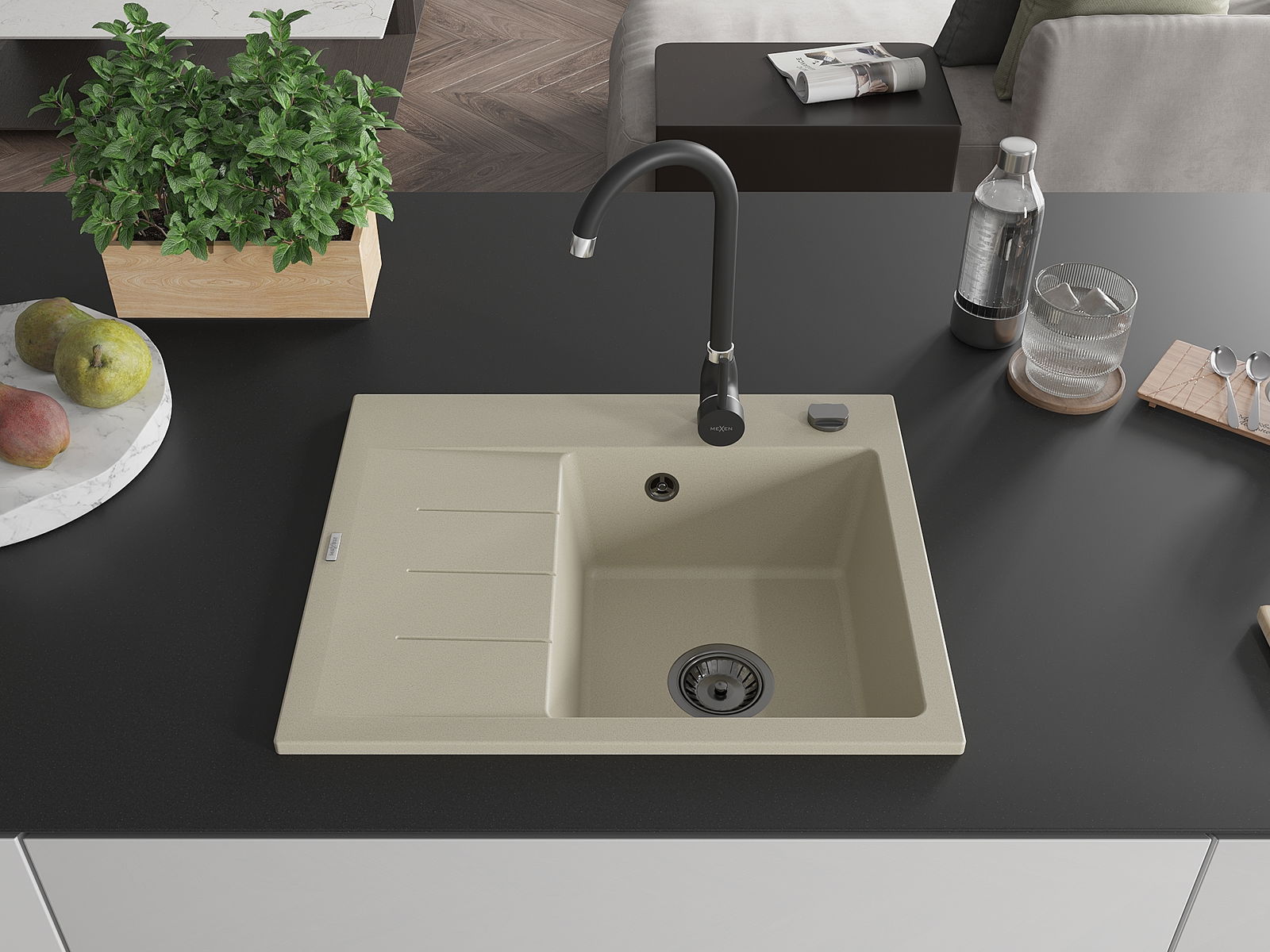 Den Ëmwäschbecken ass aus héichwäertege Granit gemaach. Et stellt eng elegant awer virun allem praktesch Ergänzung fir all Kichen duer, onofhängeg vun hirem Stil. Déi héich Qualitéit an Haltbarkeet vum Granit suergen fir méi järelaang Benotzung.