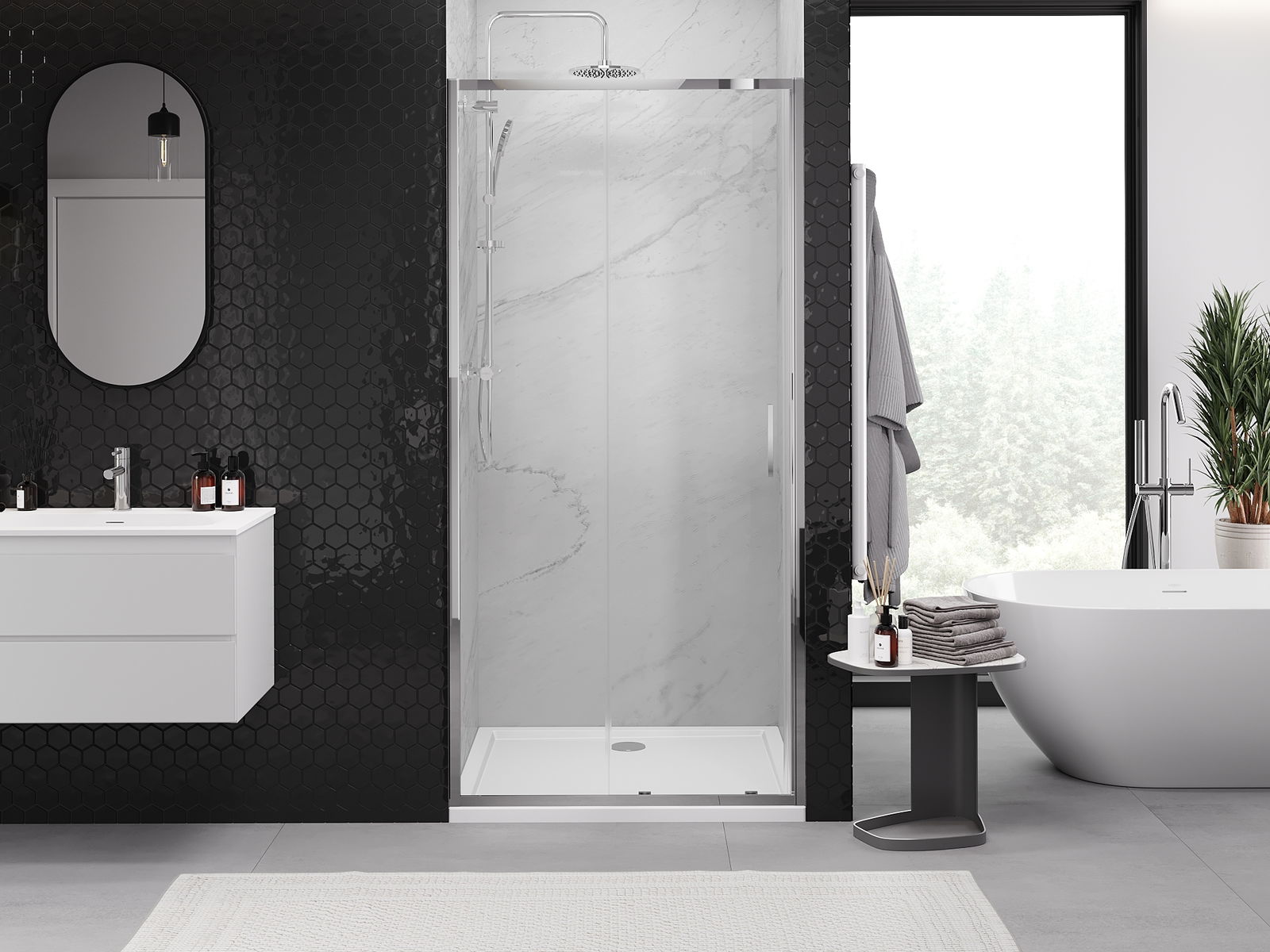 Dank dem universelle Montagesystem kënnen d'Duschdieren op der lénker oder op der rietser Säit montéiert ginn, ofhängeg vun de Besoinen. Duerch dëst kënns du de Buedzëmmer-Dusch mat Liichtegkeet un de Raum upassen.