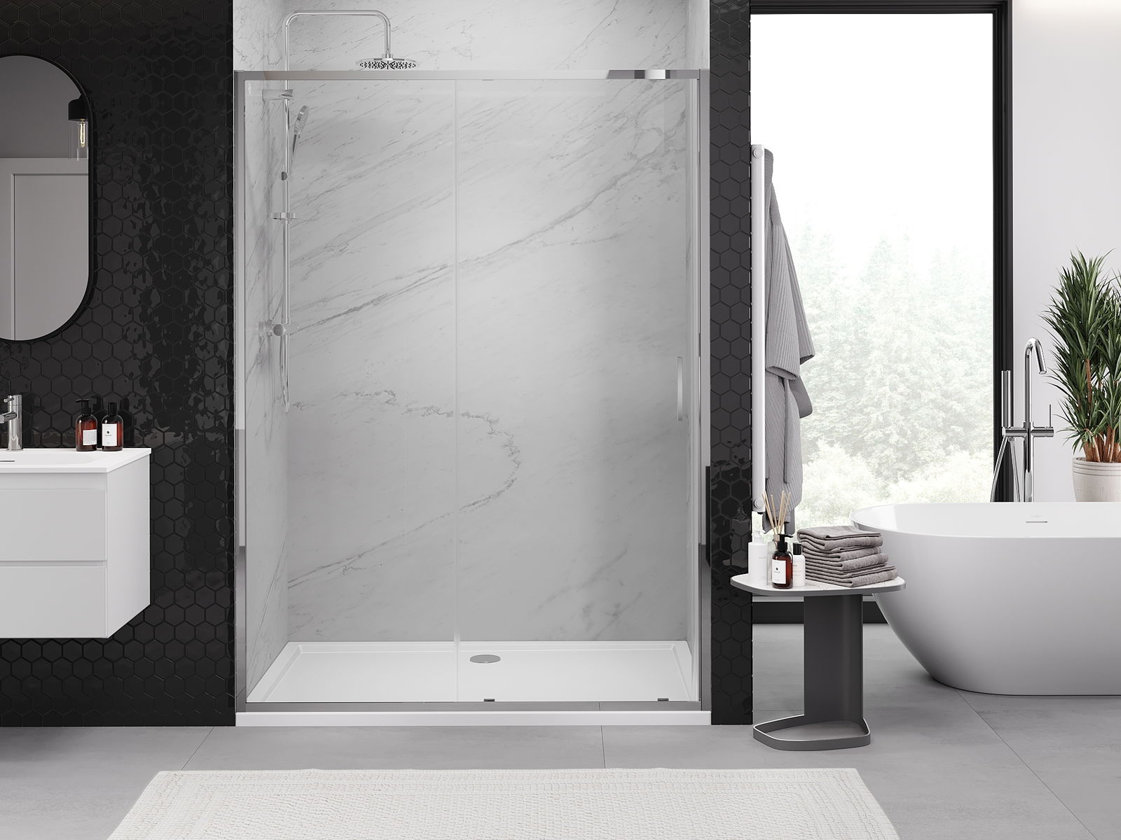 Dank dem universelle Montagesystem kënnen d'Duschdieren op der lénker oder op der rietser Säit montéiert ginn, ofhängeg vun de Besoinen. Duerch dëst kënns du de Buedzëmmer-Dusch mat Liichtegkeet un de Raum upassen.