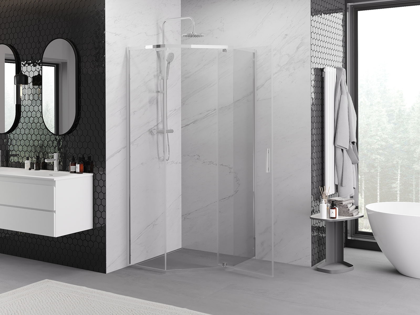 Dank dem universelle Montagesystem kënnen d'Duschdieren op der lénker oder op der rietser Säit montéiert ginn, ofhängeg vun de Besoinen. Duerch dëst kënns du de Buedzëmmer-Dusch mat Liichtegkeet un de Raum upassen.