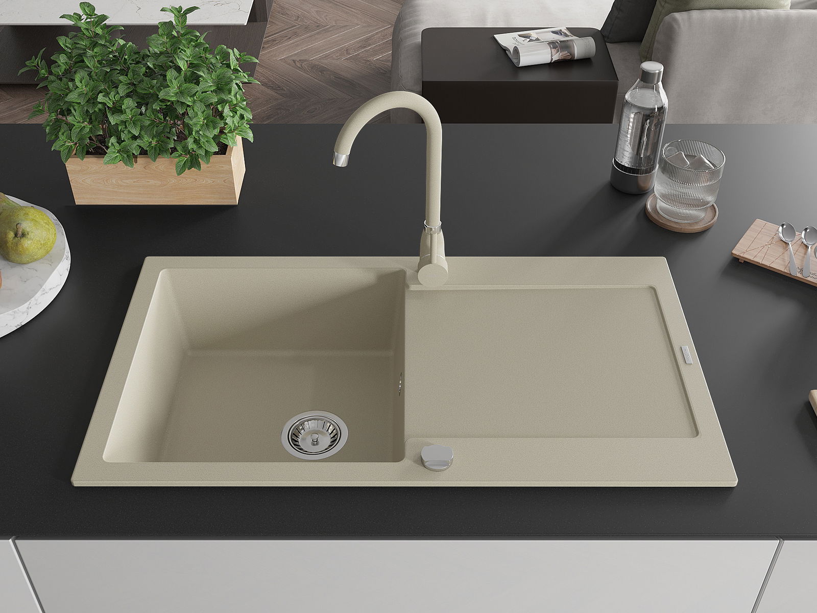 D'Uewerfläch vum Spullstee ass fleck- a verfärbungsresistent, wat se einfach ze botzen mécht an hir Faarf iwwer eng laang Zäit vum Gebrauch behalen léisst. Esthetesch an praktesch Ergänzung fir all Kichen.